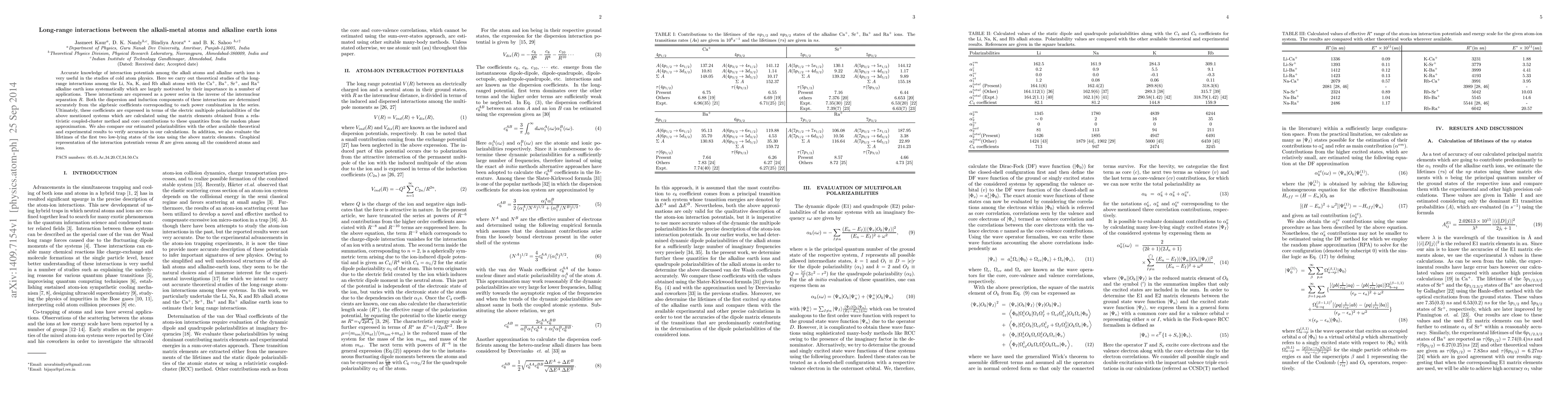 Accurate knowledge of interaction potentials among the alkali atoms and alkaline earth ions is very useful in the studies of cold atom physics. Here we carry out theoretical studies of the long-range interactions among the Li, Na, K, and Rb alkali atoms with the Ca$^+$, Ba$^+$, Sr$^+$, and Ra$^+$ alkaline earth ions systematically which are largely motivated by their importance in a number of applications. These interactions are expressed as a power series in the inverse of the internuclear separation $R$. Both the dispersion and induction components of these interactions are determined accurately from the algebraic coefficients corresponding to each power combination in the series. Ultimately, these coefficients are expressed in terms of the electric multipole polarizabilities of the above mentioned systems which are calculated using the matrix elements obtained from a relativistic coupled-cluster method and core contributions to these quantities from the random phase approximation. We also compare our estimated polarizabilities with the other available theoretical and experimental results to verify accuracies in our calculations. In addition, we also evaluate the lifetimes of the first two low-lying states of the ions using the above matrix elements. Graphical representation of the interaction potentials versus $R$ are given among all the considered atoms and ions.