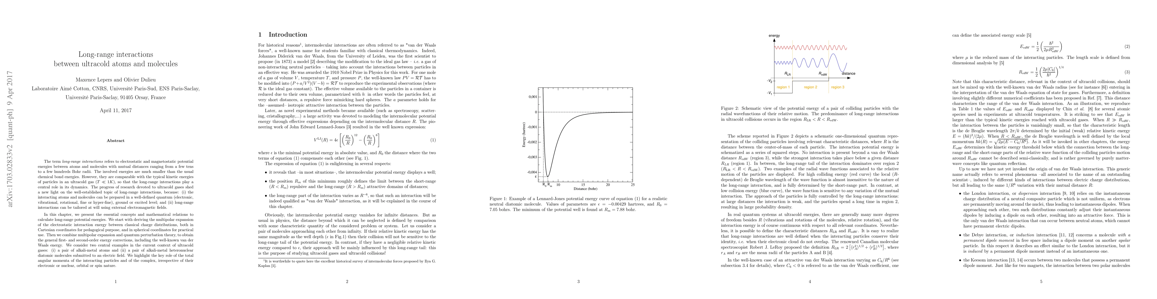 This paper explores long-range interactions between ultracold atoms and molecules, emphasizing their significance in ultracold gas dynamics due to their comparable energy with typical kinetic energies. It presents mathematical frameworks for calculating these interactions, including multipolar expansions and quantum perturbation theory, and applies these to alkali-metal atoms and heteronuclear diatomic molecules under electric fields.