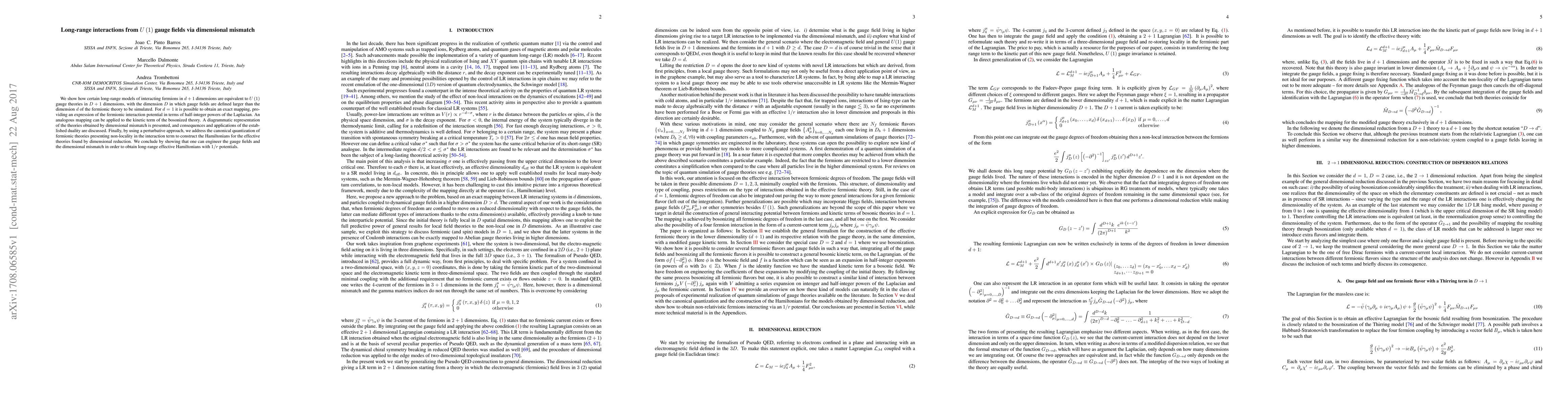 We show how certain long-range models of interacting fermions in $d+1$ dimensions are equivalent to $U\left(1\right)$ gauge theories in $D+1$ dimensions, with the dimension $D$ in which gauge fields are defined larger than the dimension $d$ of the fermionic theory to be simulated. For $d=1$ it is possible to obtain an exact mapping, providing an expression of the fermionic interaction potential in terms of half-integer powers of the Laplacian. An analogous mapping can be applied to the kinetic term of the bosonized theory. A diagrammatic representation of the theories obtained by dimensional mismatch is presented, and consequences and applications of the established duality are discussed. Finally, by using a perturbative approach, we address the canonical quantization of fermionic theories presenting non-locality in the interaction term to construct the Hamiltonians for the effective theories found by dimensional reduction. We conclude by showing that one can engineer the gauge fields and the dimensional mismatch in order to obtain long-range effective Hamiltonians with $1/r$ potentials.