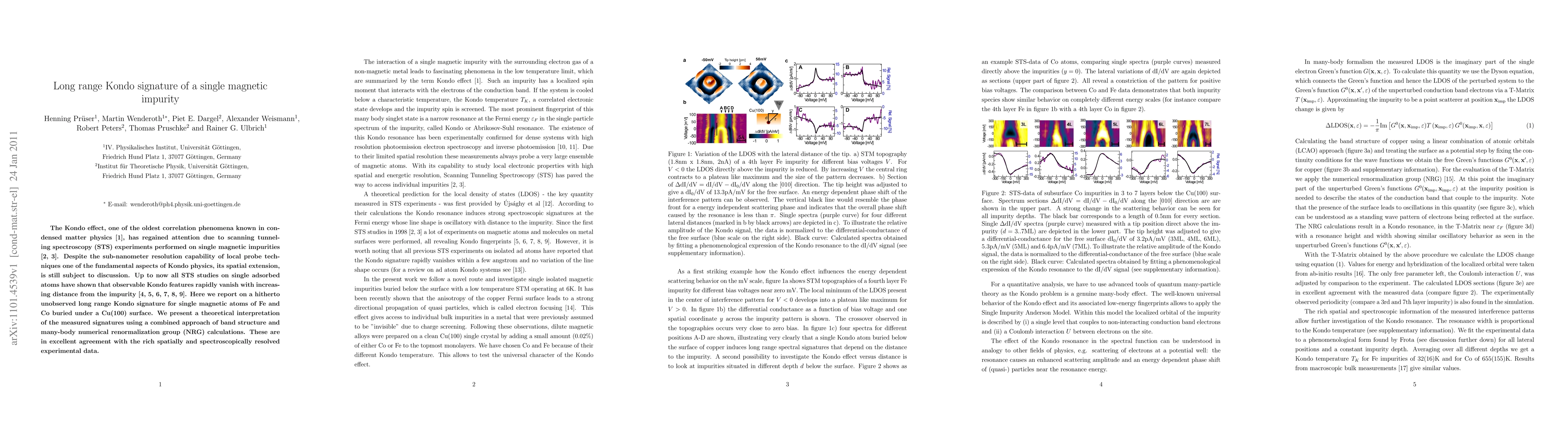 The Kondo effect, one of the oldest correlation phenomena known in condensed matter physics, has regained attention due to scanning tunneling spectroscopy (STS) experiments performed on single magnetic impurities. Despite the sub-nanometer resolution capability of local probe techniques one of the fundamental aspects of Kondo physics, its spatial extension, is still subject to discussion. Up to now all STS studies on single adsorbed atoms have shown that observable Kondo features rapidly vanish with increasing distance from the impurity. Here we report on a hitherto unobserved long range Kondo signature for single magnetic atoms of Fe and Co buried under a Cu(100) surface. We present a theoretical interpretation of the measured signatures using a combined approach of band structure and many-body numerical renormalization group (NRG) calculations. These are in excellent agreement with the rich spatially and spectroscopically resolved experimental data.
