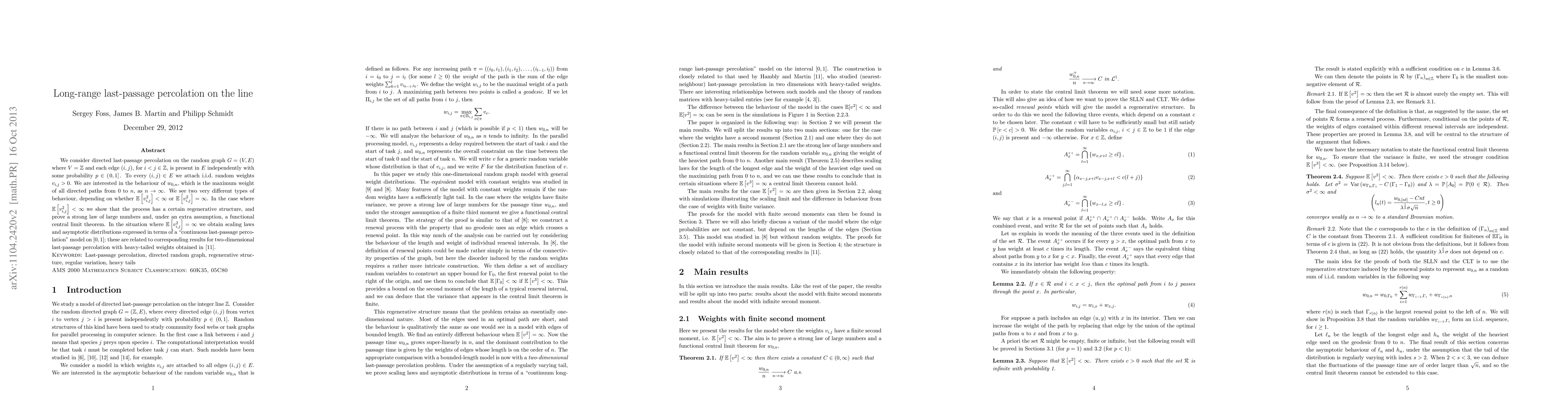 This paper examines the behavior of directed last-passage percolation on the integer line with random edge weights, revealing two distinct regimes based on the second moment of the weights. It proves a strong law of large numbers and a functional central limit theorem when the second moment is finite, and derives scaling laws and asymptotic distributions linked to continuous last-passage percolation when it is infinite.