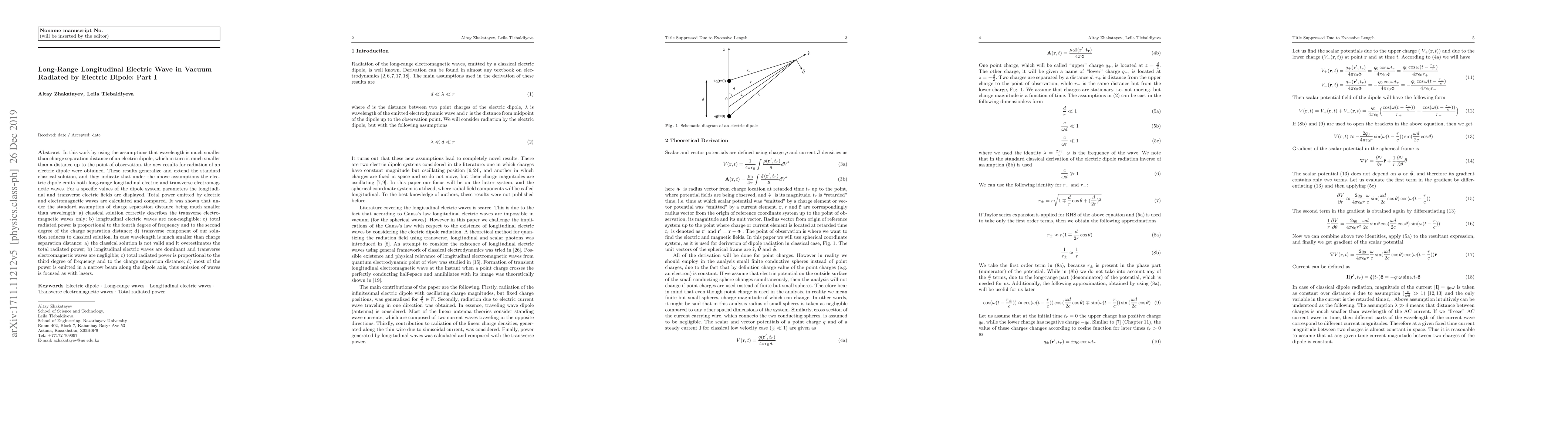 This paper generalizes classical solutions for electric dipole radiation, showing that under certain conditions, dipoles emit both longitudinal electric and transverse electromagnetic waves. It reveals that when the wavelength is much smaller than the charge separation, the classical solution overestimates power and longitudinal waves dominate, focusing the emission.