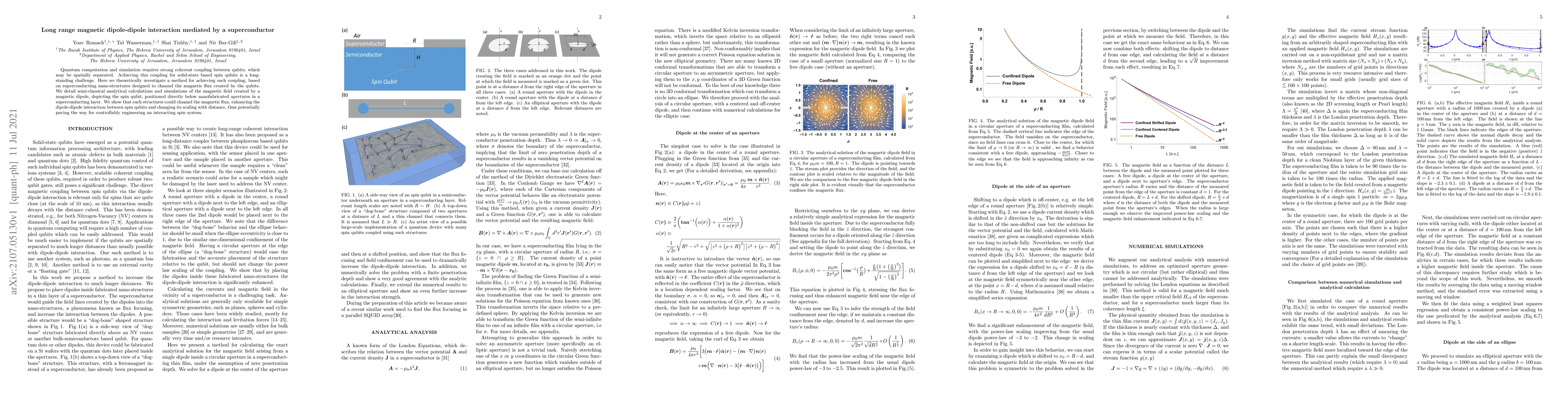 Quantum computation and simulation requires strong coherent coupling between qubits, which may be spatially separated. Achieving this coupling for solid-state based spin qubits is a long-standing challenge. Here we theoretically investigate a method for achieving such coupling, based on superconducting nano-structures designed to channel the magnetic flux created by the qubits. We detail semi-classical analytical calculations and simulations of the magnetic field created by a magnetic dipole, depicting the spin qubit, positioned directly below nanofabricated apertures in a superconducting layer. We show that such structures could channel the magnetic flux, enhancing the dipole-dipole interaction between spin qubits and changing its scaling with distance, thus potentially paving the way for controllably engineering an interacting spin system.