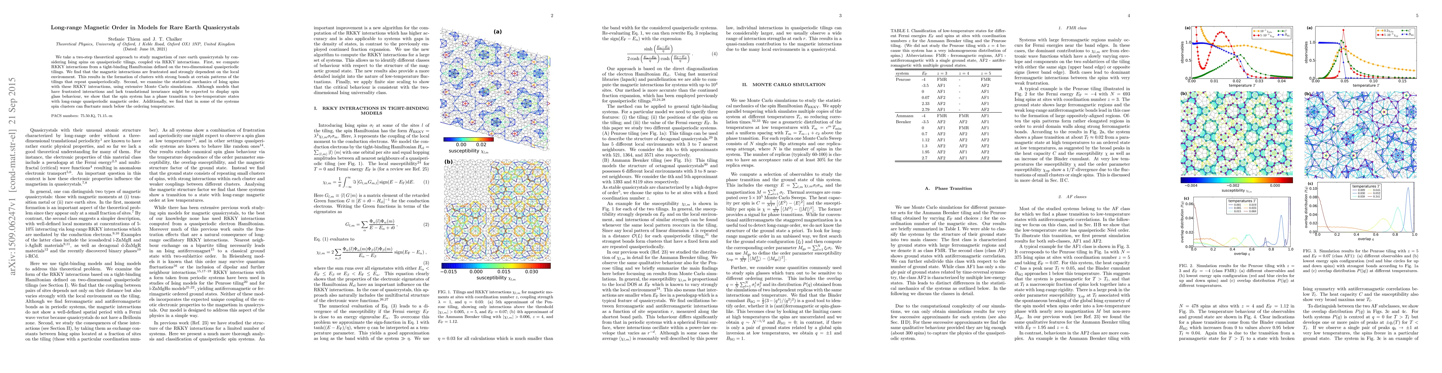 This paper investigates the magnetism in rare earth quasicrystals using Ising spins on quasiperiodic tilings coupled via RKKY interactions. It finds that despite frustration and strong local dependence, the system exhibits a phase transition to long-range quasiperiodic magnetic order, contrary to expectations of spin glass behavior.
