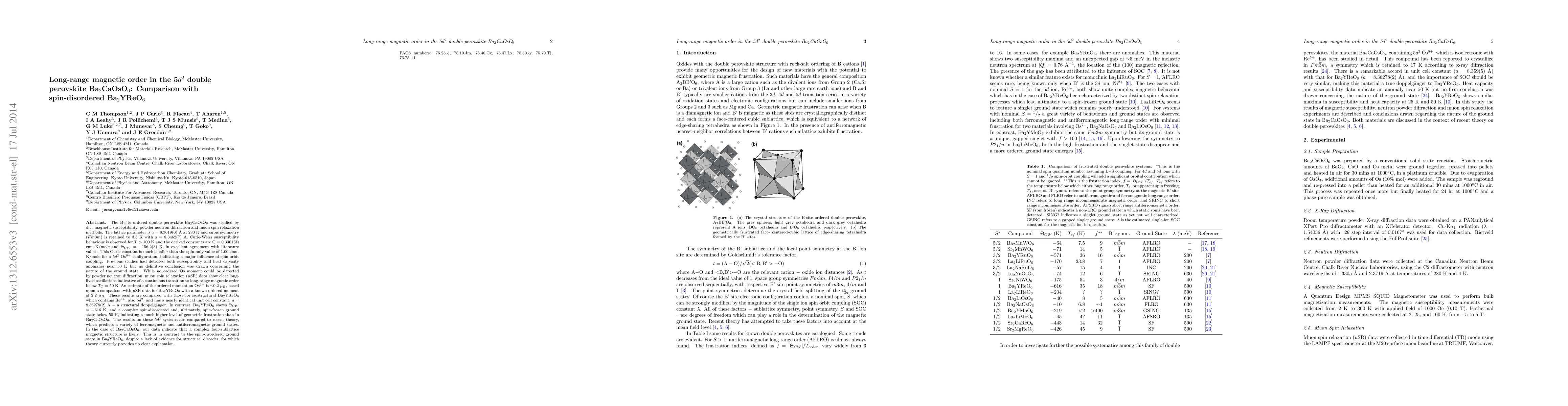 The study of Ba2CaOsO6 reveals long-range magnetic order below 50K, with an ordered moment of ~0.2 mu_B, influenced by spin-orbit coupling. This contrasts with isostructural Ba2YReO6, which exhibits a spin-disordered state, highlighting varying frustration levels in 5d^2 double perovskites.