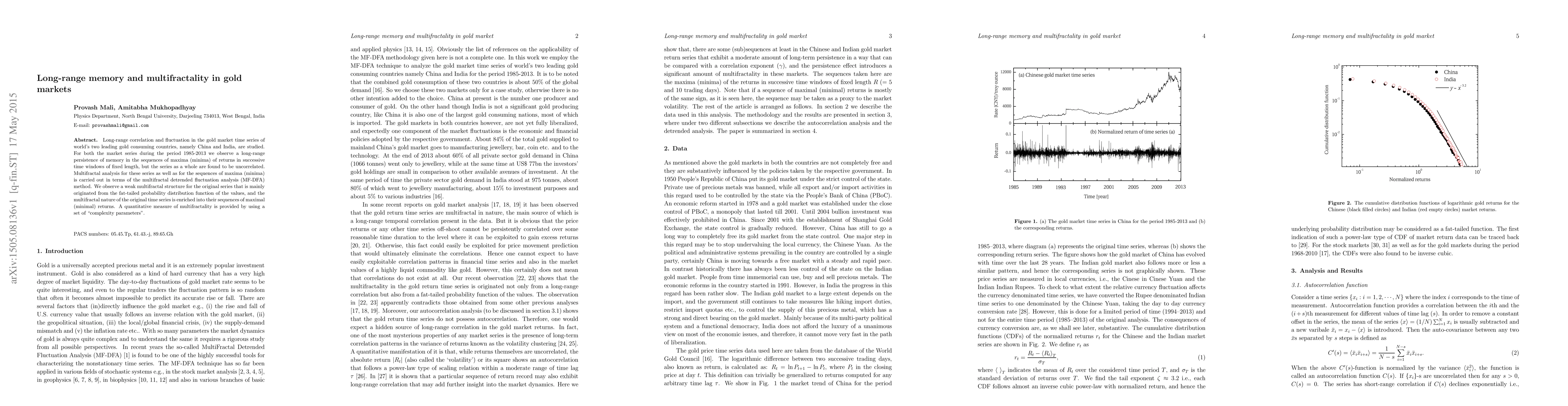 Long-range correlation and fluctuation in the gold market time series of world's two leading gold consuming countries, namely China and India, are studied. For both the market series during the period 1985-2013 we observe a long-range persistence of memory in the sequences of maxima (minima) of returns in successive time windows of fixed length, but the series as a whole are found to be uncorrelated. Multifractal analysis for these series as well as for the sequences of maxima (minima) is carried out in terms of the multifractal detrended fluctuation analysis (MF-DFA) method. We observe a weak multifractal structure for the original series that is mainly originated from the fat-tailed probability distribution function of the values, and the multifractal nature of the original time series is enriched into their sequences of maximal (minimal) returns. A quantitative measure of multifractality is provided by using a set of "complexity parameters".