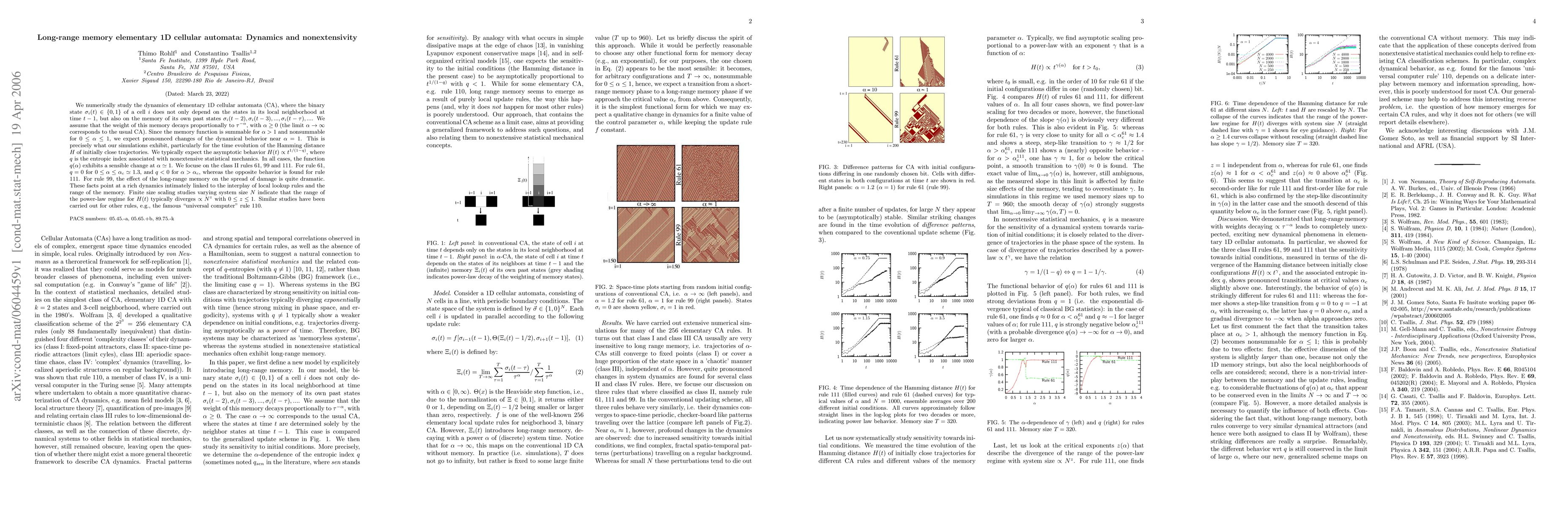 We numerically study the dynamics of elementary 1D cellular automata (CA), where the binary state $\sigma_i(t) \in \{0,1\}$ of a cell $i$ does not only depend on the states in its local neighborhood at time $t-1$, but also on the memory of its own past states $\sigma_i(t-2), \sigma_i(t-3),...,\sigma_i(t-\tau),...$. We assume that the weight of this memory decays proportionally to $\tau^{-\alpha}$, with $\alpha \ge 0$ (the limit $\alpha \to \infty$ corresponds to the usual CA). Since the memory function is summable for $\alpha>1$ and nonsummable for $0\le \alpha \le 1$, we expect pronounced %qualitative and quantitative changes of the dynamical behavior near $\alpha=1$. This is precisely what our simulations exhibit, particularly for the time evolution of the Hamming distance $H$ of initially close trajectories. We typically expect the asymptotic behavior $H(t) \propto t^{1/(1-q)}$, where $q$ is the entropic index associated with nonextensive statistical mechanics. In all cases, the function $q(\alpha)$ exhibits a sensible change at $\alpha \simeq 1$. We focus on the class II rules 61, 99 and 111. For rule 61, $q = 0$ for $0 \le \alpha \le \alpha_c \simeq 1.3$, and $q<0$ for $\alpha> \alpha_c$, whereas the opposite behavior is found for rule 111. For rule 99, the effect of the long-range memory on the spread of damage is quite dramatic. These facts point at a rich dynamics intimately linked to the interplay of local lookup rules and the range of the memory. Finite size scaling studies varying system size $N$ indicate that the range of the power-law regime for $H(t)$ typically diverges $\propto N^z$ with $0 \le z \le 1$. Similar studies have been carried out for other rules, e.g., the famous "universal computer" rule 110.