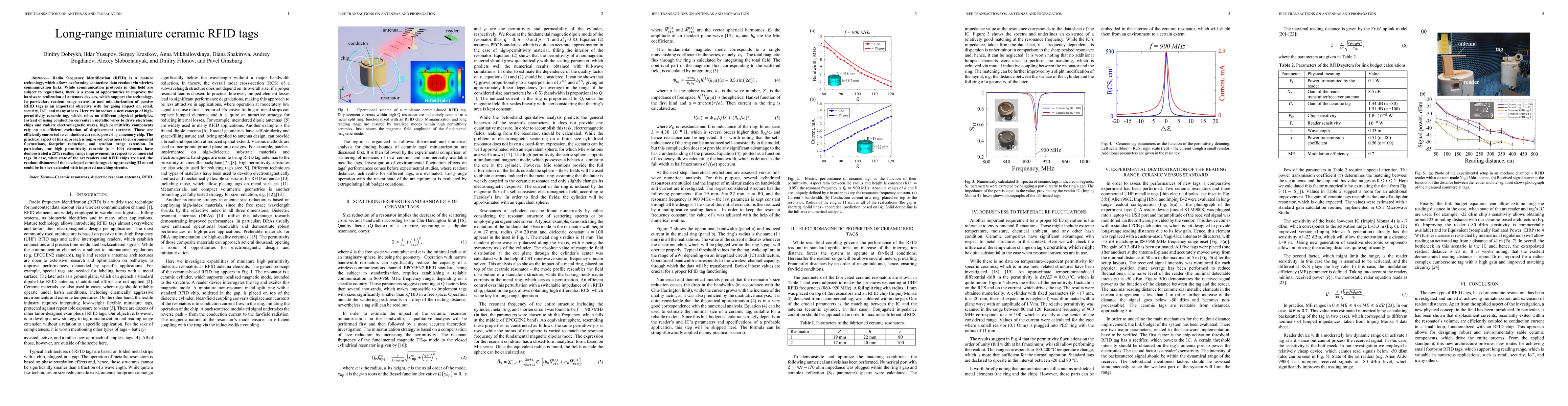 This paper introduces a novel high-permittivity ceramic RFID tag concept that significantly extends reading range and reduces size by utilizing displacement currents instead of metallic conduction currents. The ceramic tags show a 25% improvement in reading range compared to commercial tags, achieving distances up to 23 meters.
