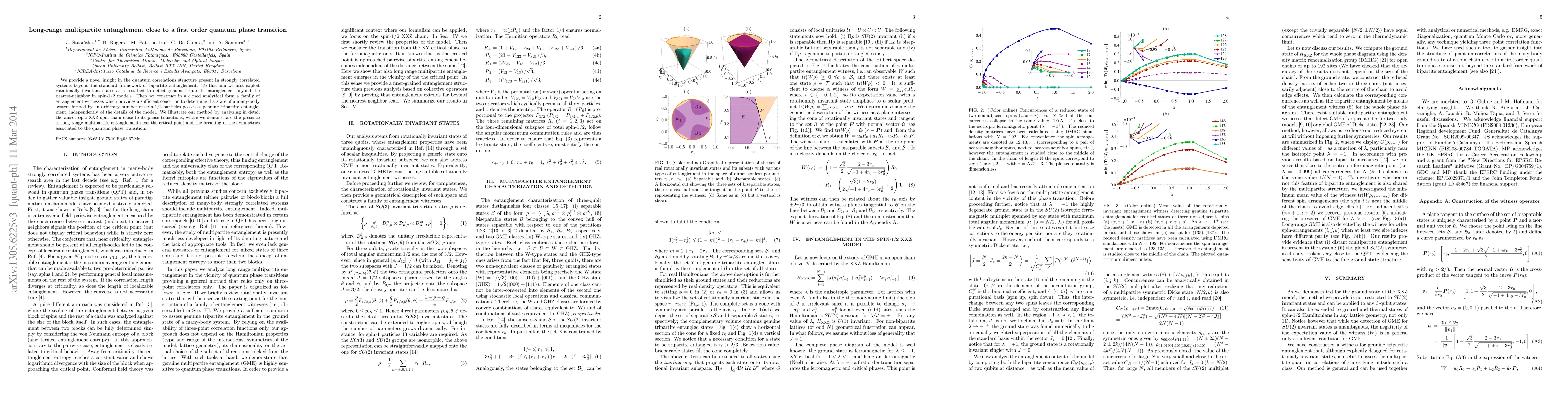 We provide insight in the quantum correlations structure present in strongly correlated systems beyond the standard framework of bipartite entanglement. To this aim we first exploit rotationally invariant states as a test bed to detect genuine tripartite entanglement beyond the nearest-neighbor in spin-1/2 models. Then we construct in a closed analytical form a family of entanglement witnesses which provides a sufficient condition to determine if a state of a many-body system formed by an arbitrary number of spin-1/2 particles possesses genuine tripartite entanglement, independently of the details of the model. We illustrate our method by analyzing in detail the anisotropic XXZ spin chain close to its phase transitions, where we demonstrate the presence of long range multipartite entanglement near the critical point and the breaking of the symmetries associated to the quantum phase transition.