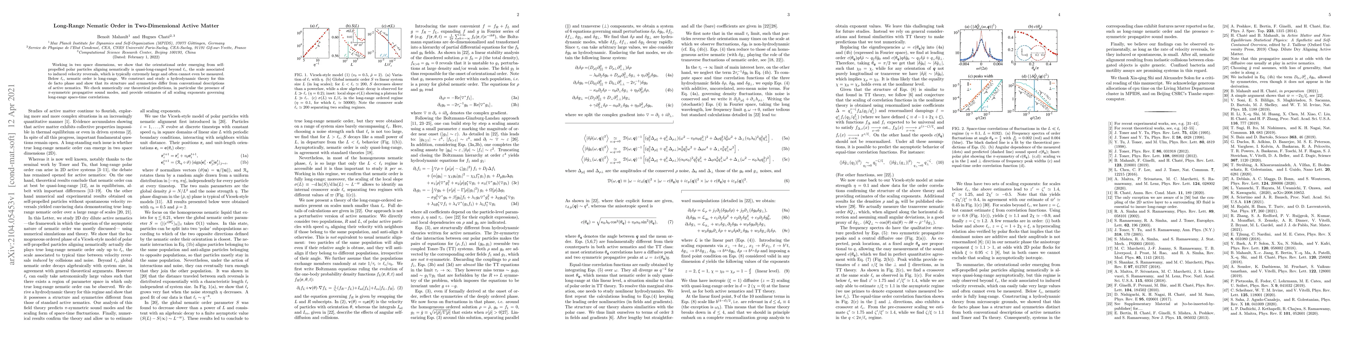 This paper demonstrates that in two-dimensional active matter, nematic order exhibits quasi-long-range characteristics beyond a large, often unmeasurable scale $\ell_{\rm r}$. The authors develop a hydrodynamic theory for this phase, revealing distinct structural and symmetry properties compared to conventional active nematics, and validate their findings through numerical simulations.