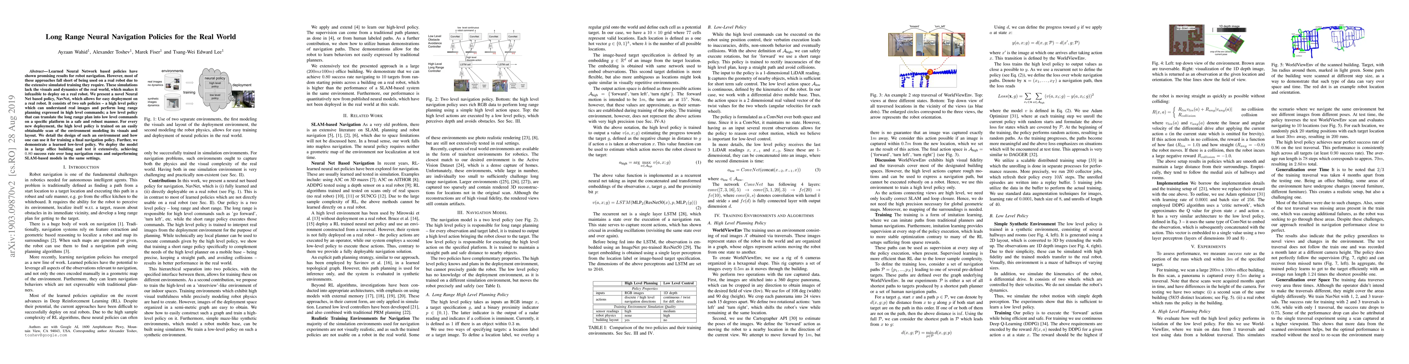Learned Neural Network based policies have shown promising results for robot navigation. However, most of these approaches fall short of being used on a real robot due to the extensive simulated training they require. These simulations lack the visuals and dynamics of the real world, which makes it infeasible to deploy on a real robot. We present a novel Neural Net based policy, NavNet, which allows for easy deployment on a real robot. It consists of two sub policies -- a high level policy which can understand real images and perform long range planning expressed in high level commands; a low level policy that can translate the long range plan into low level commands on a specific platform in a safe and robust manner. For every new deployment, the high level policy is trained on an easily obtainable scan of the environment modeling its visuals and layout. We detail the design of such an environment and how one can use it for training a final navigation policy. Further, we demonstrate a learned low-level policy. We deploy the model in a large office building and test it extensively, achieving $0.80$ success rate over long navigation runs and outperforming SLAM-based models in the same settings.