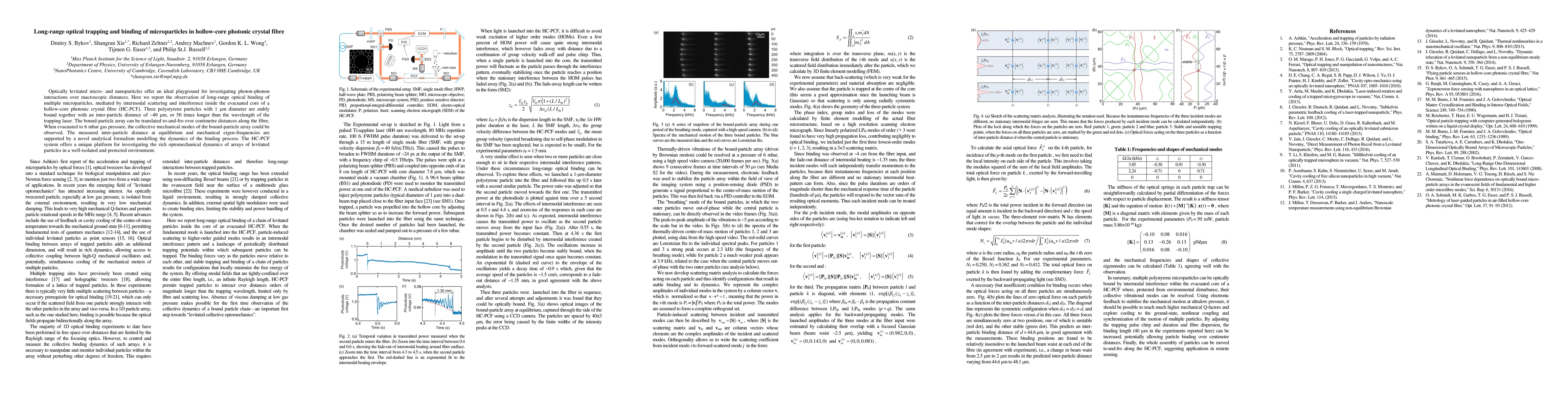 This paper reports the long-range optical trapping and binding of microparticles inside a hollow-core photonic crystal fibre, demonstrating stable inter-particle binding over distances 50 times the trapping laser wavelength. The system allows for the study of optomechanical dynamics in a protected environment.