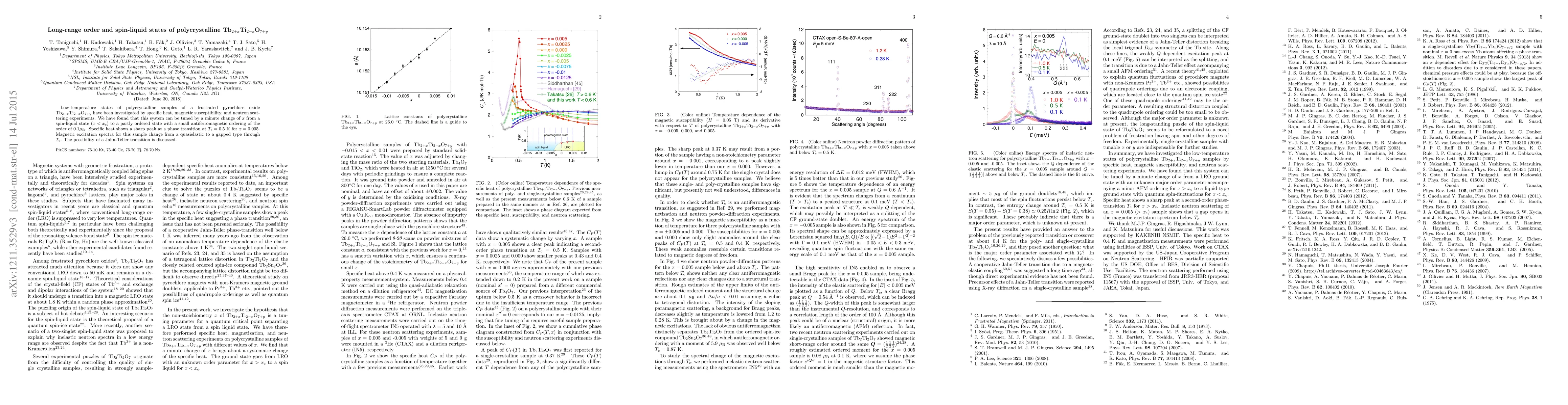 Low-temperature states of polycrystalline samples of a frustrated pyrochlore oxide Tb$_{2+x}$Ti$_{2-x}$O$_{7+y}$ have been investigated by specific heat, magnetic susceptibility, and neutron scattering experiments. We have found that this system can be tuned by a minute change of $x$ from a spin-liquid state ($x < x_{\text{c}}$) to a partly ordered state with a small antiferromagnetic ordering of the order of $0.1 \mu_{\text{B}}$. Specific heat shows a sharp peak at a phase transition at $T_{\text{c}}= 0.5$ K for $x=0.005$. Magnetic excitation spectra for this sample change from a quasielastic to a gapped type through $T_{\text{c}}$. The possibility of a Jahn-Teller transition is discussed.