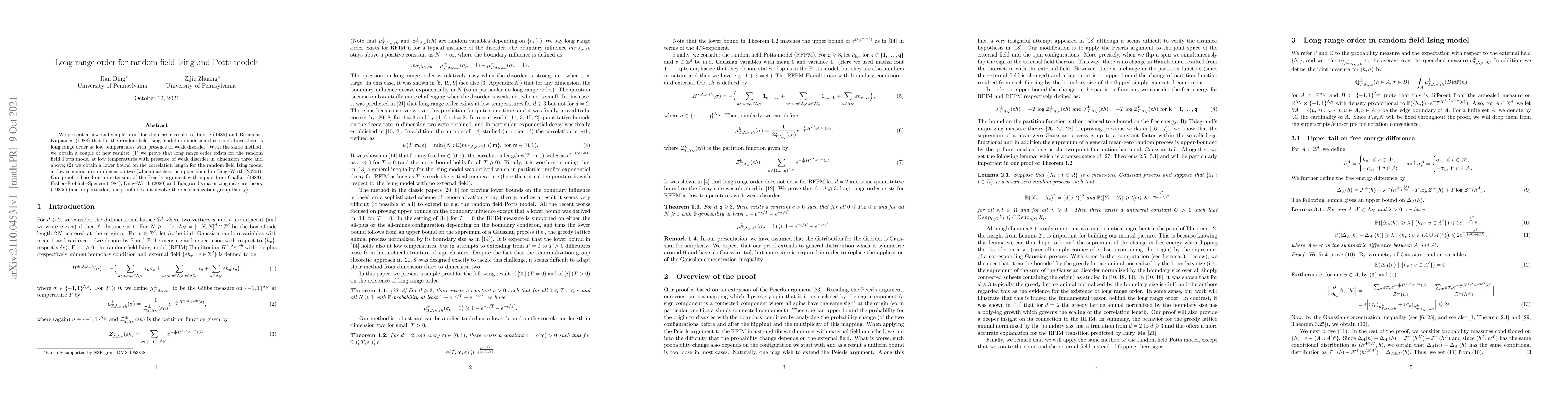 We present a new and simple proof for the classic results of Imbrie (1985) and Bricmont-Kupiainen (1988) that for the random field Ising model in dimension three and above there is long range order at low temperatures with presence of weak disorder. With the same method, we obtain a couple of new results: (1) we prove that long range order exists for the random field Potts model at low temperatures with presence of weak disorder in dimension three and above; (2) we obtain a lower bound on the correlation length for the random field Ising model at low temperatures in dimension two (which matches the upper bound in Ding-Wirth (2020)). Our proof is based on an extension of the Peierls argument with inputs from Chalker (1983), Fisher-Fr\"ohlich-Spencer (1984), Ding-Wirth (2020) and Talagrand's majorizing measure theory (1980s) (and in particular, our proof does not involve the renormalization group theory).