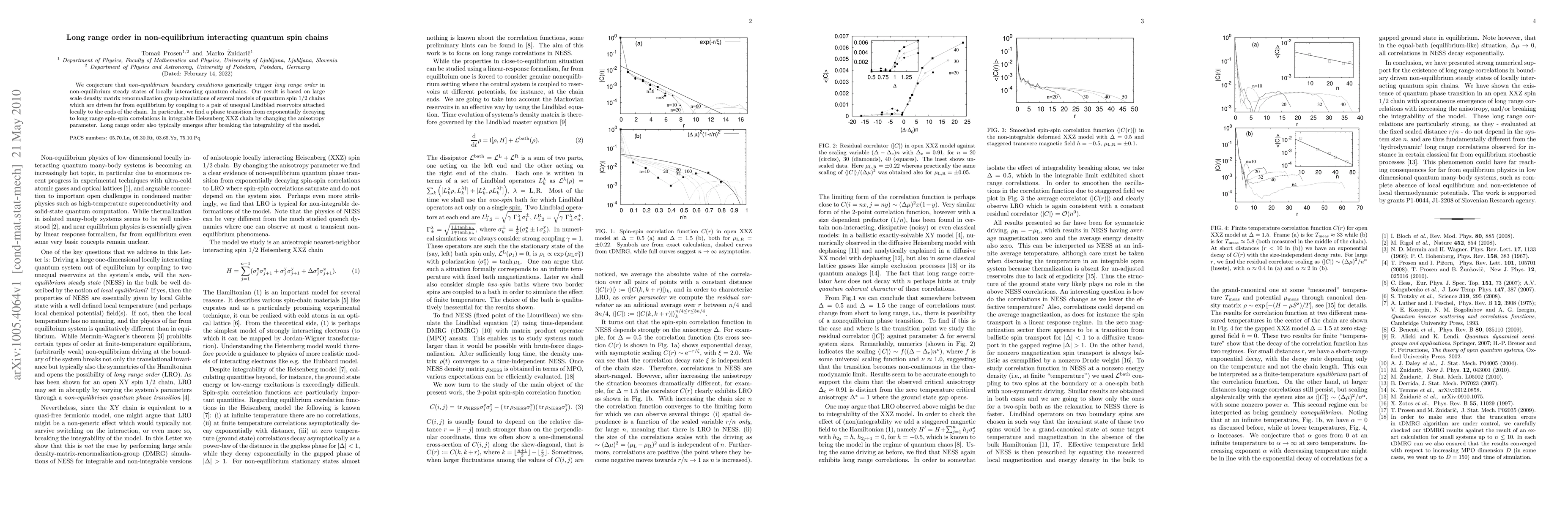 Non-equilibrium boundary conditions induce long range order in steady states of interacting quantum spin chains, as demonstrated by density matrix renormalization group simulations showing phase transitions in integrable and non-integrable models. Key finding: Phase transition from decaying to long range spin correlations in the Heisenberg XXZ chain with varying anisotropy.
