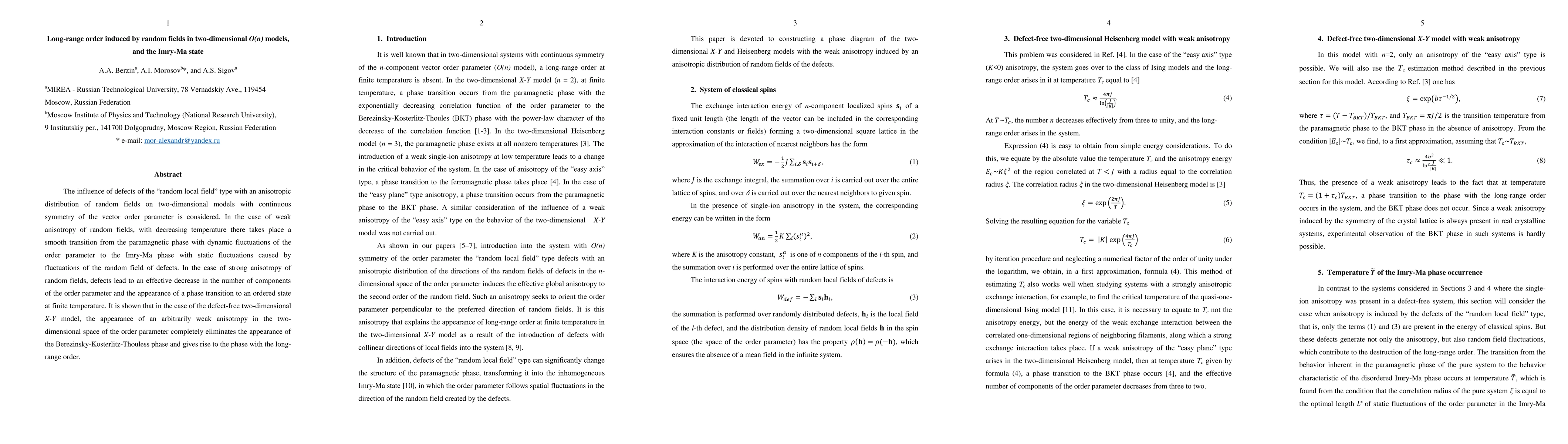 The influence of defects of the "random local field" type with an anisotropic distribution of random fields on two-dimensional models with continuous symmetry of the vector order parameter is considered. In the case of weak anisotropy of random fields, with decreasing temperature there takes place a smooth transition from the paramagnetic phase with dynamic fluctuations of the order parameter to the Imry-Ma phase with static fluctuations caused by fluctuations of the random field of defects. In the case of strong anisotropy of random fields, defects lead to an effective decrease in the number of components of the order parameter and the appearance of a phase transition to an ordered state at finite temperature. It is shown that in the case of the defect-free two-dimensional X-Y model, the appearance of an arbitrarily weak anisotropy in the two-dimensional space of the order parameter completely eliminates the appearance of the Berezinsky-Kosterlitz-Thouless phase and gives rise to the phase with the long-range order.