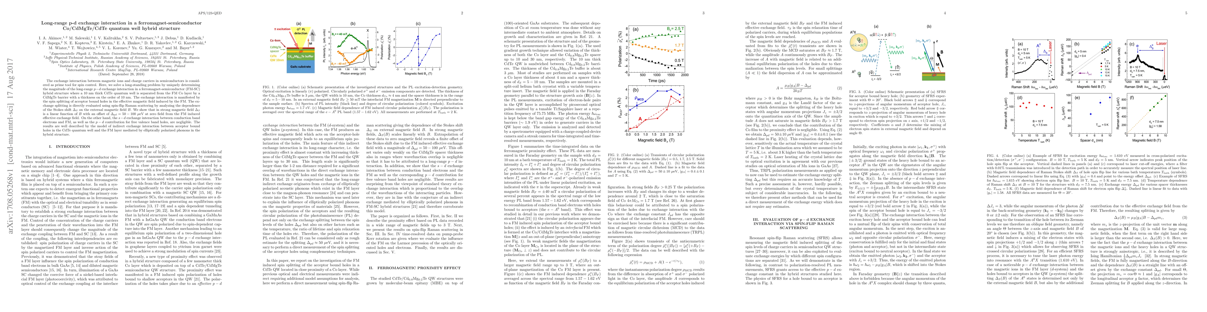 The exchange interaction between magnetic ions and charge carriers in semiconductors is considered as prime tool for spin control. Here, we solve a long-standing problem by uniquely determining the magnitude of the long-range $p-d$ exchange interaction in a ferromagnet-semiconductor (FM-SC) hybrid structure where a 10~nm thick CdTe quantum well is separated from the FM Co layer by a CdMgTe barrier with a thickness on the order of 10~nm. The exchange interaction is manifested by the spin splitting of acceptor bound holes in the effective magnetic field induced by the FM. The exchange splitting is directly evaluated using spin-flip Raman scattering by analyzing the dependence of the Stokes shift $\Delta_S$ on the external magnetic field $B$. We show that in strong magnetic field $\Delta_S$ is a linear function of $B$ with an offset of $\Delta_{pd} = 50-100~\mu$eV at zero field from the FM induced effective exchange field. On the other hand, the $s-d$ exchange interaction between conduction band electrons and FM, as well as the $p-d$ contribution for free valence band holes, are negligible. The results are well described by the model of indirect exchange interaction between acceptor bound holes in the CdTe quantum well and the FM layer mediated by elliptically polarized phonons in the hybrid structure.