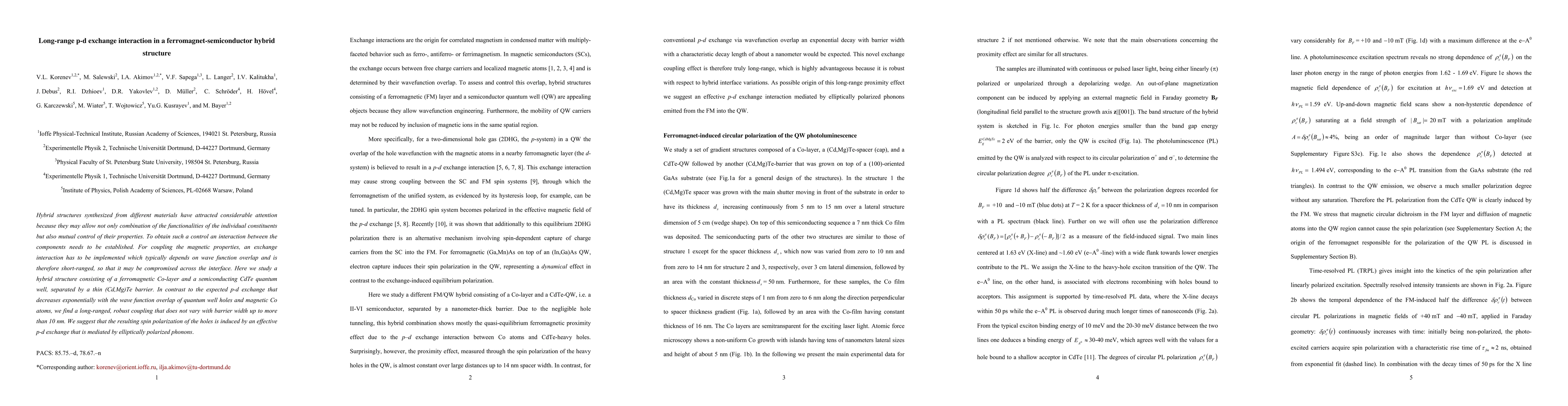 This paper investigates a ferromagnet-semiconductor hybrid structure comprising a Co-layer and CdTe quantum well separated by a (Cd,Mg)Te barrier, revealing a long-range p-d exchange interaction that defies typical exponential decay, suggesting phonon mediation for the observed spin polarization.