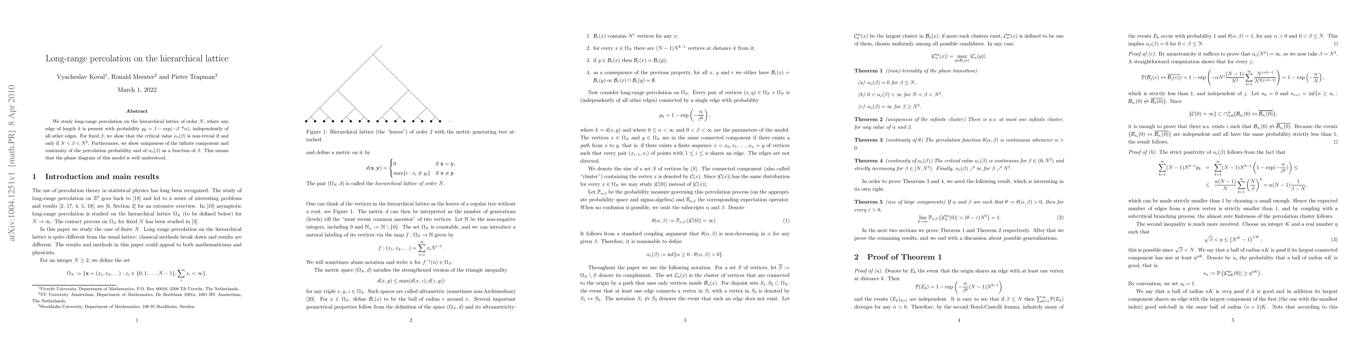 This paper investigates long-range percolation on a hierarchical lattice, demonstrating that the critical value $\alpha_c(\beta)$ is non-trivial when $N < \beta < N^2$, and proves the uniqueness of the infinite component and the continuity of the percolation probability and $\alpha_c(\beta)$ with respect to $\beta$.