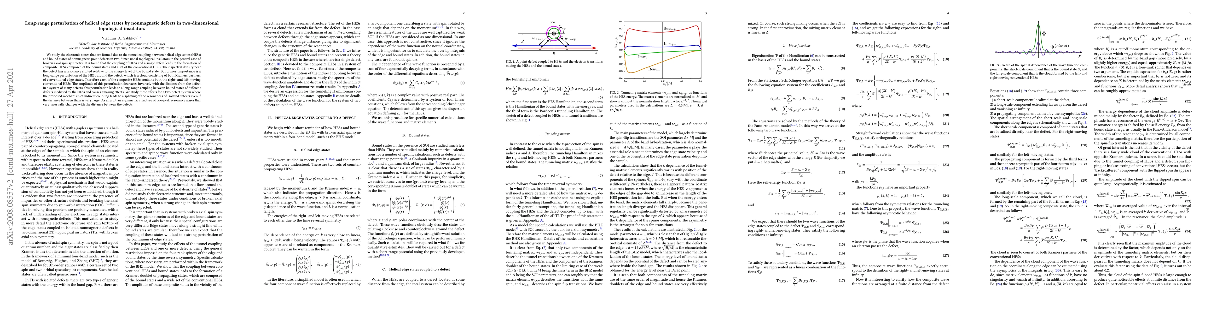 We study the electronic states that are formed due to the tunnel coupling between helical edge states (HESs) and bound states of nonmagnetic point defects in two-dimensional topological insulators in the general case of broken axial spin symmetry. It is found that the coupling of HESs and a single defect leads to the formation of composite HESs composed of the bound states and a set of the conventional HESs. Their spectral density near the defect has a resonance shifted relative to the energy level of the bound state. But of most importance is a long-range perturbation of the HESs around the defect, which is a cloud consisting of both Kramers partners of conventional edge states. Therefore each of the composite HESs contains both the right- and left-moving conventional HESs. The amplitude of this perturbation decreases inversely with the distance from the defect. In a system of many defects, this perturbation leads to a long-range coupling between bound states of different defects mediated by the HESs and causes amazing effects. We study these effects for a two-defect system where the proposed mechanism of indirect coupling leads to a splitting of the resonances of isolated defects even if the distance between them is very large. As a result an asymmetric structure of two-peak resonance arises that very unusually changes with the distance between the defects.