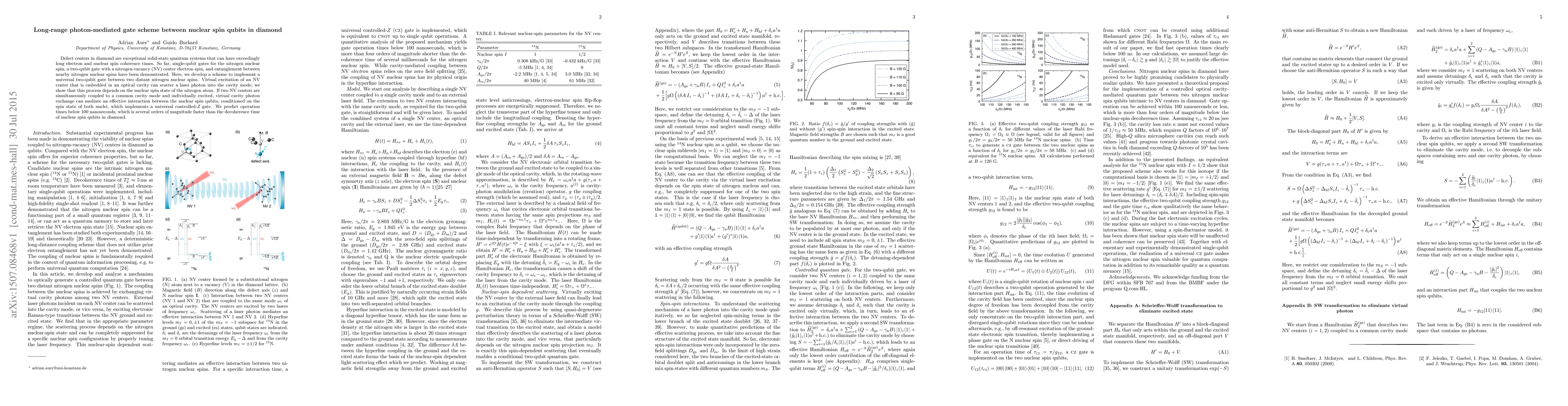 This paper proposes a method to implement a universal two-qubit gate between two distant nitrogen nuclear spin qubits in diamond using a photon-mediated gate scheme. The scheme leverages NV centers in optical cavities to mediate effective interactions between nuclear spins via virtual cavity photon exchange, achieving operation times significantly faster than nuclear spin decoherence.