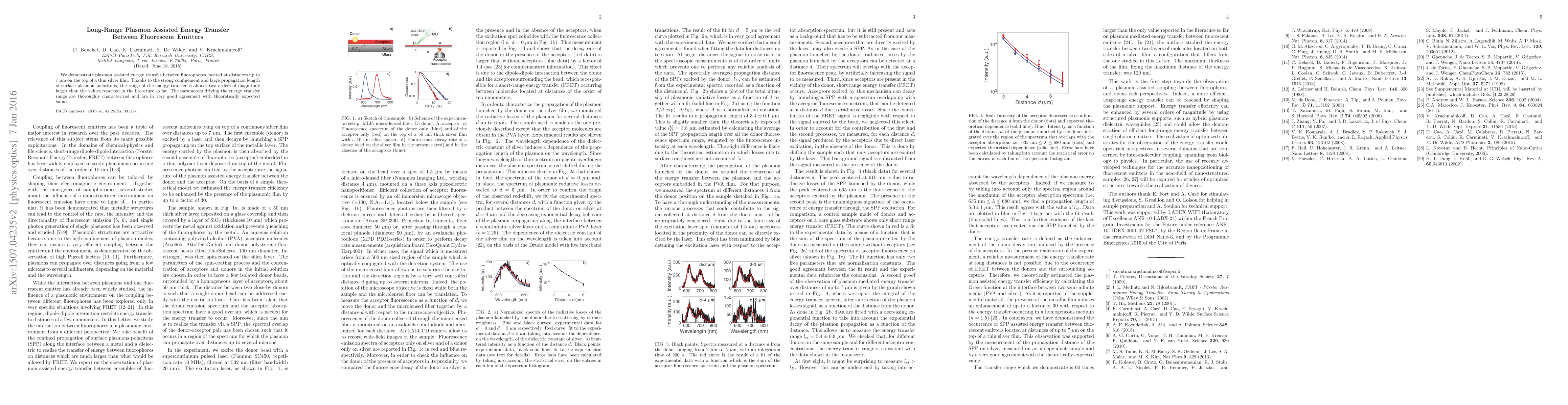 This paper demonstrates long-range plasmon-assisted energy transfer between fluorescent emitters up to $7 \, \mu$m apart on a thin silver film, achieving a transfer range nearly two orders of magnitude larger than previously reported. The study thoroughly characterizes the parameters influencing this transfer and finds strong agreement with theoretical predictions.