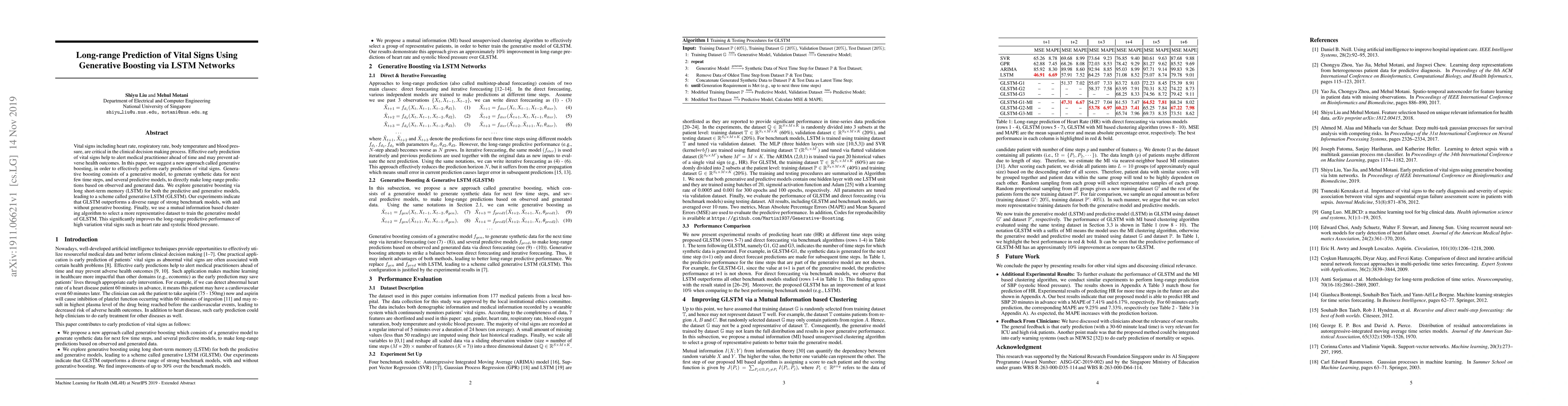Vital signs including heart rate, respiratory rate, body temperature and blood pressure, are critical in the clinical decision making process. Effective early prediction of vital signs help to alert medical practitioner ahead of time and may prevent adverse health outcomes. In this paper, we suggest a new approach called generative boosting, in order to effectively perform early prediction of vital signs. Generative boosting consists of a generative model, to generate synthetic data for next few time steps, and several predictive models, to directly make long-range predictions based on observed and generated data. We explore generative boosting via long short-term memory (LSTM) for both the predictive and generative models, leading to a scheme called generative LSTM (GLSTM). Our experiments indicate that GLSTM outperforms a diverse range of strong benchmark models, with and without generative boosting. Finally, we use a mutual information based clustering algorithm to select a more representative dataset to train the generative model of GLSTM. This significantly improves the long-range predictive performance of high variation vital signs such as heart rate and systolic blood pressure.