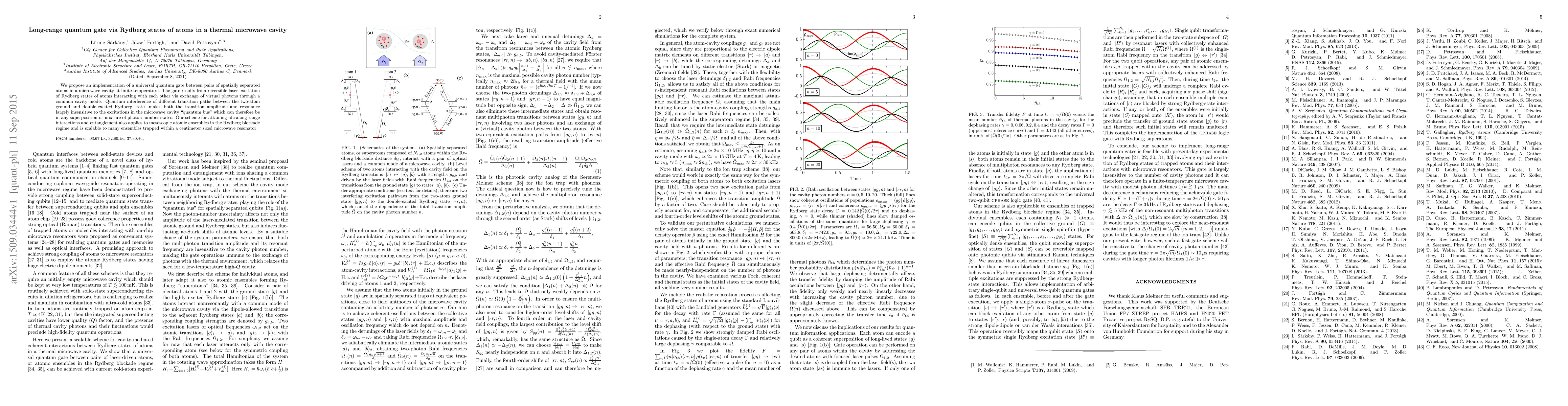 This paper proposes a universal quantum gate between spatially separated atoms using Rydberg states and a microwave cavity, achieving long-range interactions via virtual photon exchange. The gate's robustness against cavity excitations enables scalability to multiple ensembles within a small resonator.