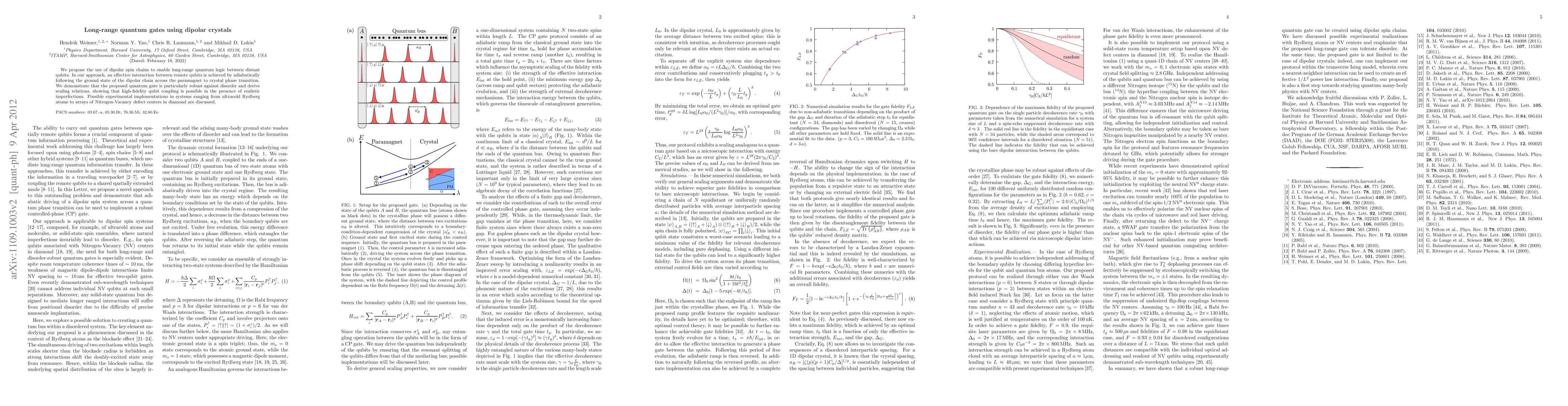 We propose the use of dipolar spin chains to enable long-range quantum logic between distant qubits. In our approach, an effective interaction between remote qubits is achieved by adiabatically following the ground state of the dipolar chain across the paramagnet to crystal phase transition. We demonstrate that the proposed quantum gate is particularly robust against disorder and derive scaling relations, showing that high-fidelity qubit coupling is possible in the presence of realistic imperfections. Possible experimental implementations in systems ranging from ultracold Rydberg atoms to arrays of Nitrogen-Vacancy defect centers in diamond are discussed.