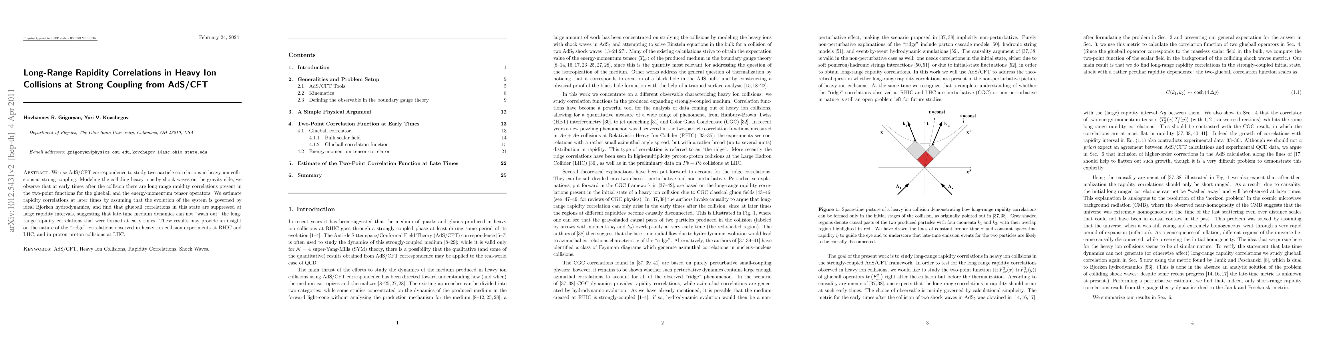 This paper uses AdS/CFT to investigate long-range rapidity correlations in heavy ion collisions at strong coupling, finding early-time correlations persist despite hydrodynamic evolution, potentially explaining "ridge" correlations observed in experiments.