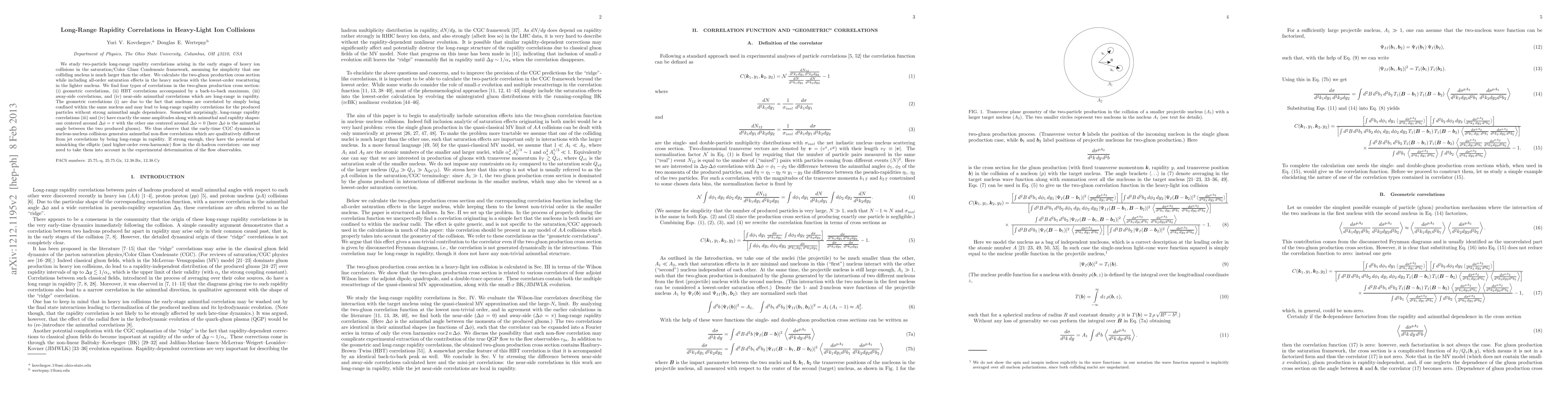 This paper investigates long-range rapidity correlations in heavy-light ion collisions within the saturation/Color Glass Condensate framework, identifying four types of correlations in two-gluon production. Notably, long-range rapidity correlations are found to have the same amplitude and shape as away-side correlations, potentially mimicking elliptic flow in experimental data.