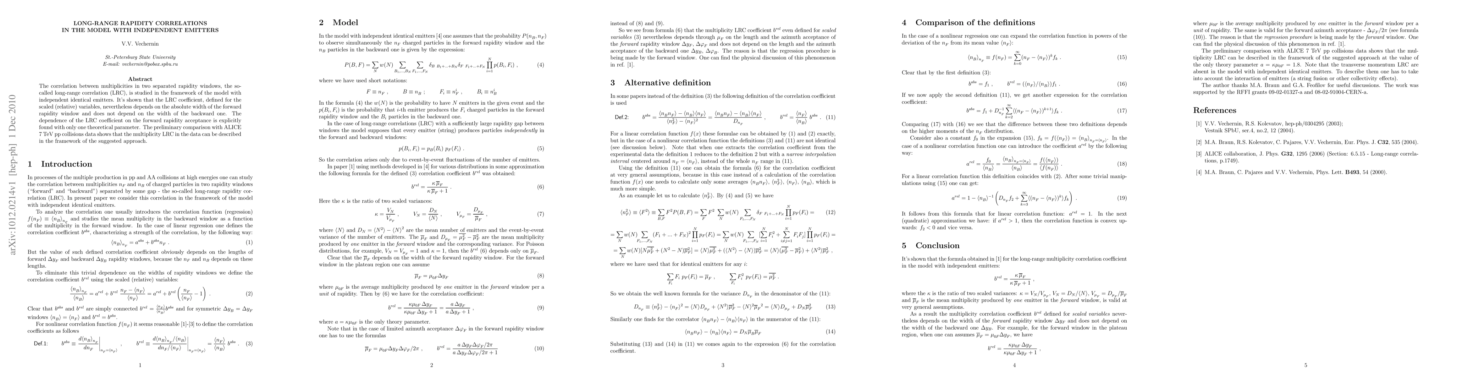 This paper investigates long-range rapidity correlations in a model with independent identical emitters, finding that the LRC coefficient depends on the forward rapidity window's width but not the backward one. The model's preliminary comparison with ALICE 7TeV pp collision data suggests it can describe observed multiplicity correlations.