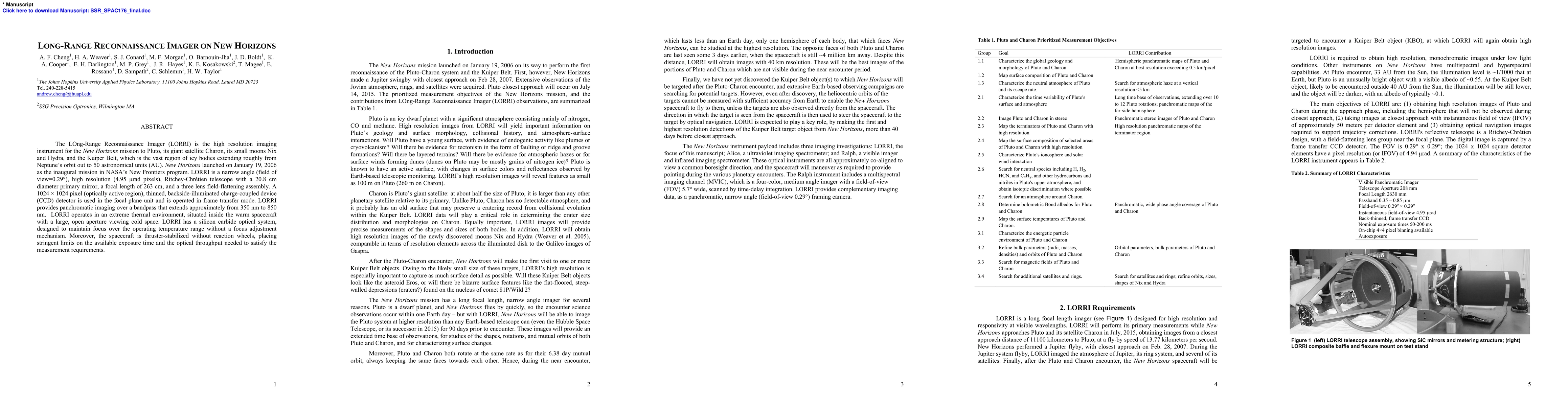 The LOng-Range Reconnaissance Imager (LORRI) is the high resolution imaging instrument for the New Horizons mission to Pluto, its giant satellite Charon, its small moons Nix and Hydra, and the Kuiper Belt, which is the vast region of icy bodies extending roughly from Neptune's orbit out to 50 astronomical units (AU). New Horizons launched on January 19, 2006 as the inaugural mission in NASA's New Frontiers program. LORRI is a narrow angle (field of view=0.29 deg), high resolution (4.95 microrad pixels), Ritchey-Chretien telescope with a 20.8 cm diameter primary mirror, a focal length of 263 cm, and a three lens field-flattening assembly. A 1024 x 1024 pixel (optically active region), thinned, backside-illuminated charge-coupled device (CCD) detector is used in the focal plane unit and is operated in frame transfer mode. LORRI provides panchromatic imaging over a bandpass that extends approximately from 350 nm to 850 nm. LORRI operates in an extreme thermal environment, situated inside the warm spacecraft with a large, open aperture viewing cold space. LORRI has a silicon carbide optical system, designed to maintain focus over the operating temperature range without a focus adjustment mechanism. Moreover, the spacecraft is thruster-stabilized without reaction wheels, placing stringent limits on the available exposure time and the optical throughput needed to satisfy the measurement requirements.
