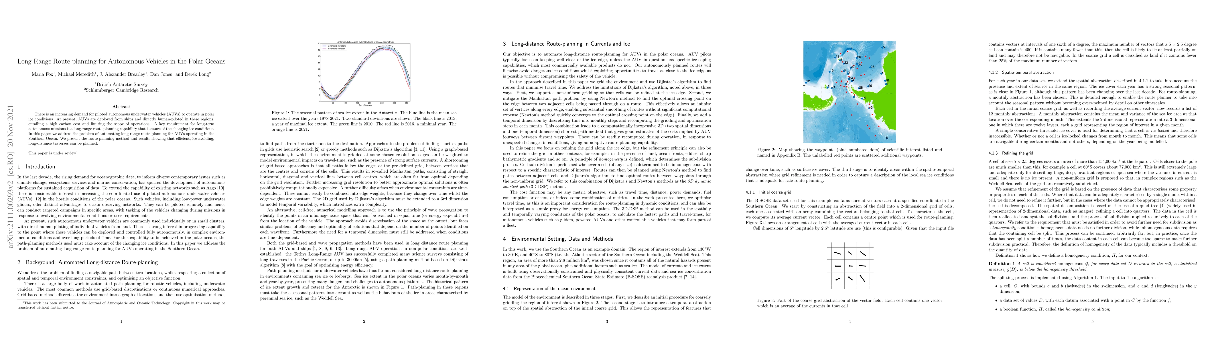 There is an increasing demand for piloted autonomous underwater vehicles (AUVs) to operate in polar ice conditions. At present, AUVs are deployed from ships and directly human-piloted in these regions, entailing a high carbon cost and limiting the scope of operations. A key requirement for long-term autonomous missions is a long-range route planning capability that is aware of the changing ice conditions. In this paper we address the problem of automating long-range route-planning for AUVs operating in the Southern Ocean. We present the route-planning method and results showing that efficient, ice-avoiding, long-distance traverses can be planned.