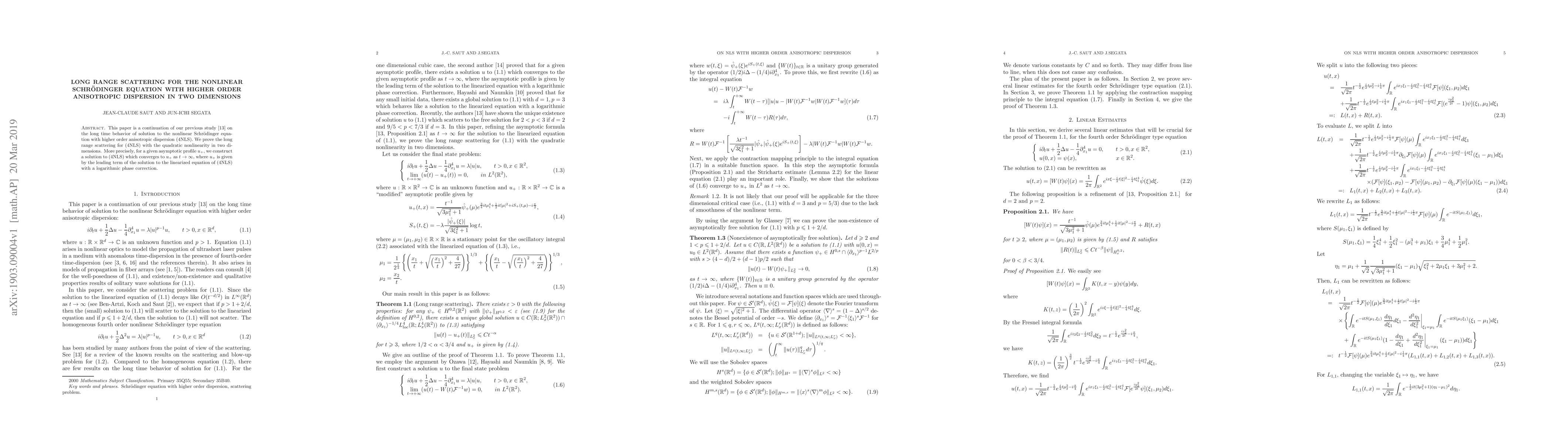 This paper proves long range scattering for the nonlinear Schrödinger equation with higher order anisotropic dispersion in two dimensions, constructing a solution that converges to a given asymptotic profile with a logarithmic phase correction. The study extends the authors' previous work on the long-time behavior of solutions to this equation.