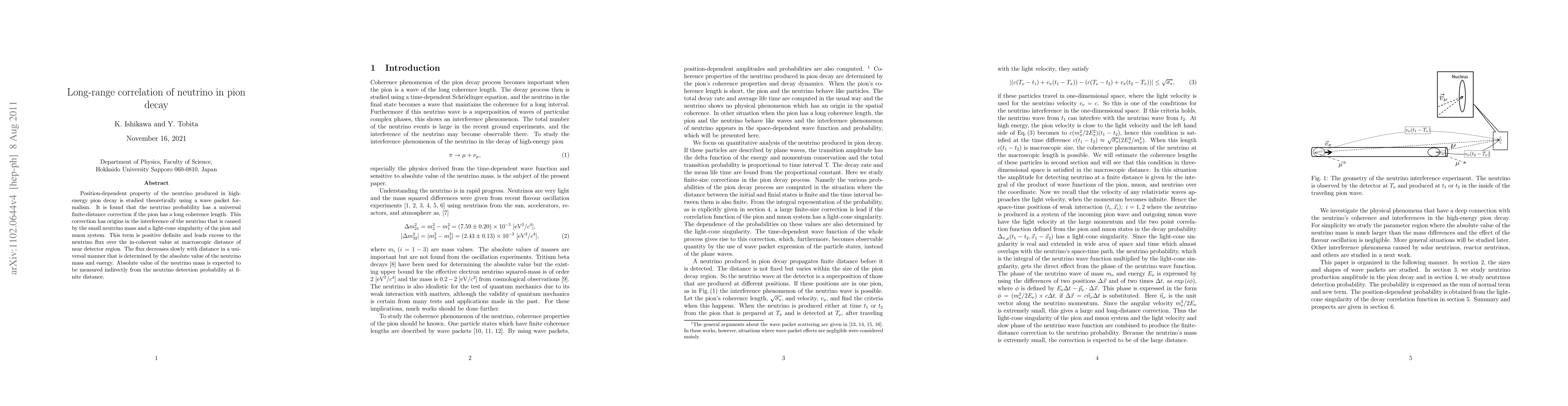 Position-dependent property of the neutrino produced in high-energy pion decay is studied theoretically using a wave packet formalism. It is found that the neutrino probability has a universal finite-distance correction if the pion has a long coherence length. This correction has origins in the interference of the neutrino that is caused by the small neutrino mass and a light-cone singularity of the pion and muon system. This term is positive definite and leads excess to the neutrino flux over the in-coherent value at macroscopic distance of near detector region. The flux decreases slowly with distance in a universal manner that is determined by the absolute value of the neutrino mass and energy. Absolute value of the neutrino mass is expected to be measured indirectly from the neutrino detection probability at finite distance.