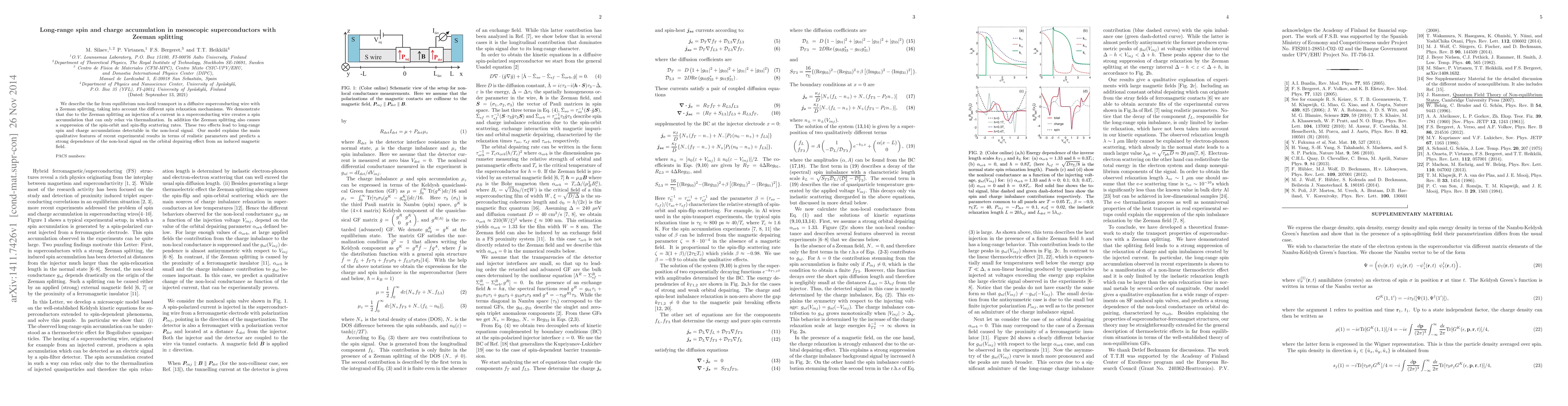 We describe the far from equilibrium non-local transport in a diffusive superconducting wire with a Zeeman splitting, taking into account the different spin relaxation mechanisms. We demonstrate that due to the Zeeman splitting an injection of a current in a superconducting wire creates a spin accumulation that can only relax via thermalization. In addition the Zeeman splitting also causes a suppression of the spin-orbit and spin-flip scattering rates. These two effects lead to long-range spin and charge accumulations detectable in the non-local signal. Our model explains the main qualitative features of recent experimental results in terms of realistic parameters and predicts a strong dependence of the non-local signal on the orbital depairing effect from an induced magnetic field.