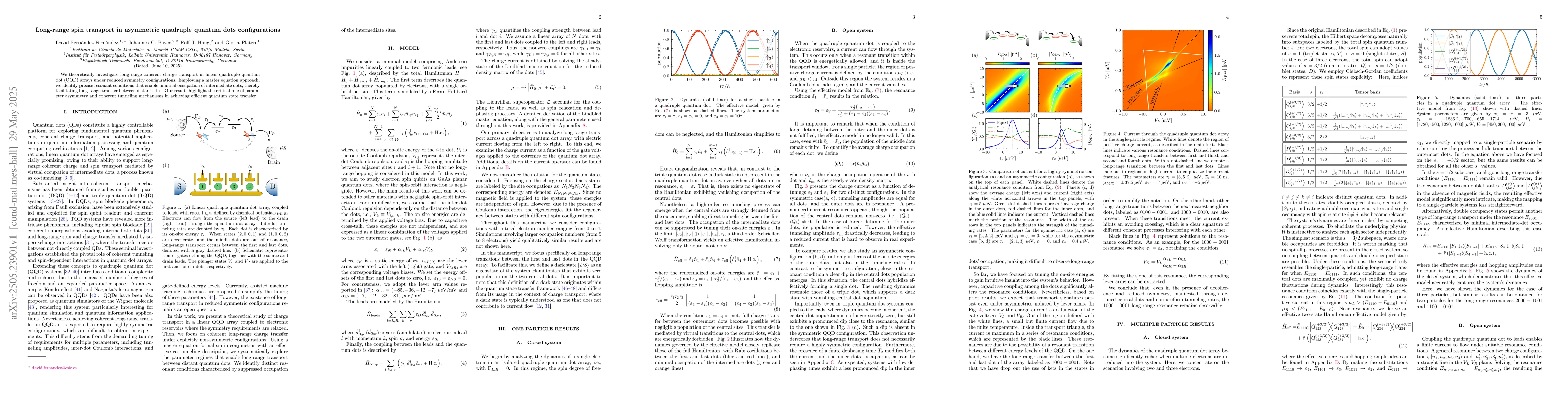 The paper introduces a detailed study of long-range spin transport in asymmetric quadruple quantum dots, emphasizing the role of parameter asymmetry and coherent tunneling, which distinguishes it from previous research focusing mainly on symmetric configurations.