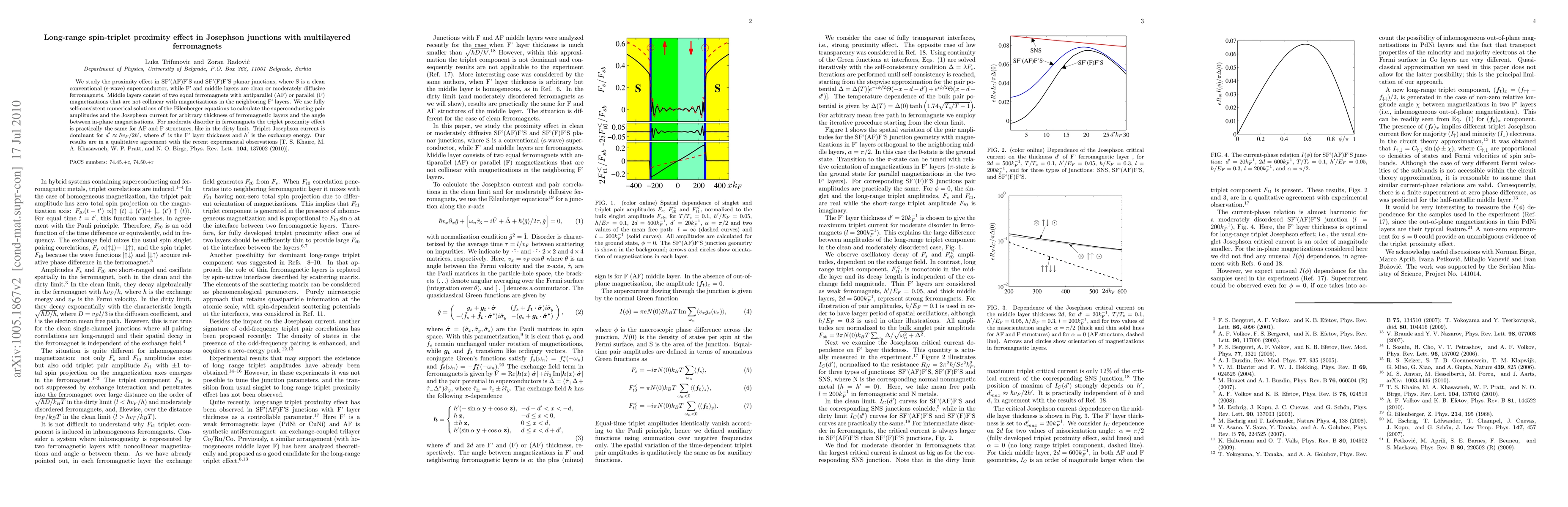 This paper investigates the long-range spin-triplet proximity effect in Josephson junctions with multilayered ferromagnets, finding that the triplet proximity effect is similar for antiferromagnetic and ferromagnetic configurations under moderate disorder. The triplet Josephson current is dominant when the thickness of the ferromagnetic layers is comparable to the Fermi wavelength divided by the exchange energy.