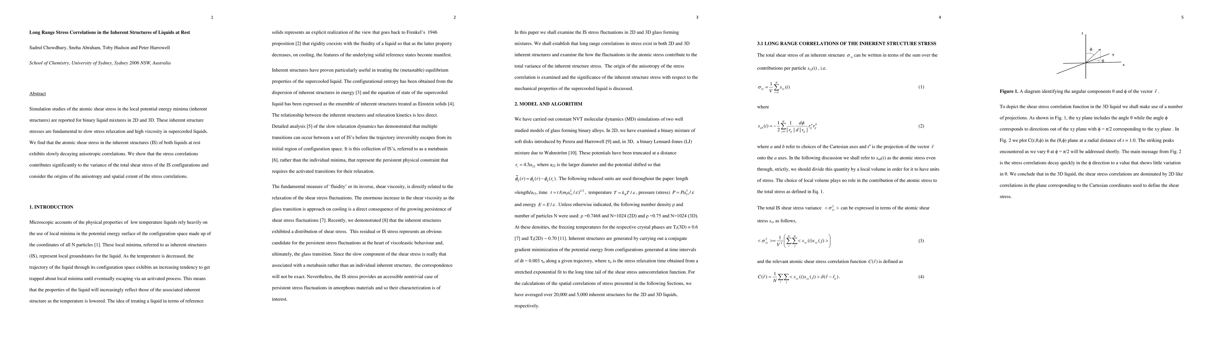 Simulation studies of the atomic shear stress in the local potential energy minima (inherent structures) are reported for binary liquid mixtures in 2D and 3D. These inherent structure stresses are fundamental to slow stress relaxation and high viscosity in supercooled liquids. We find that the atomic shear stress in the inherent structures (IS) of both liquids at rest exhibits slowly decaying anisotropic correlations. We show that the stress correlations contributes significantly to the variance of the total shear stress of the IS configurations and consider the origins of the anisotropy and spatial extent of the stress correlations.