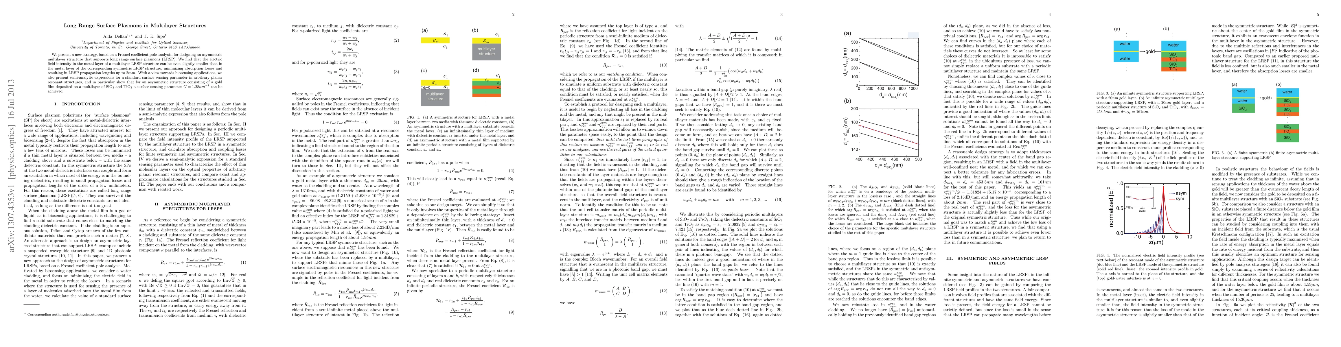 We present a new strategy, based on a Fresnel coefficient pole analysis, for designing an asymmetric multilayer structure that supports long range surface plasmons (LRSP). We find that the electric field intensity in the metal layer of a multilayer LRSP structure can be even slightly smaller than in the metal layer of the corresponding symmetric LRSP structure, minimizing absorption losses and resulting in LRSP propagation lengths up to 2mm. With a view towards biosensing applications, we also present semi-analytic expressions for a standard surface sensing parameter in arbitrary planar resonant structures, and in particular show that for an asymmetric structure consisting of a gold film deposited on a multilayer of SiO2 and TiO2 a surface sensing parameter G = 1.28(1/nm) can be achieved.
