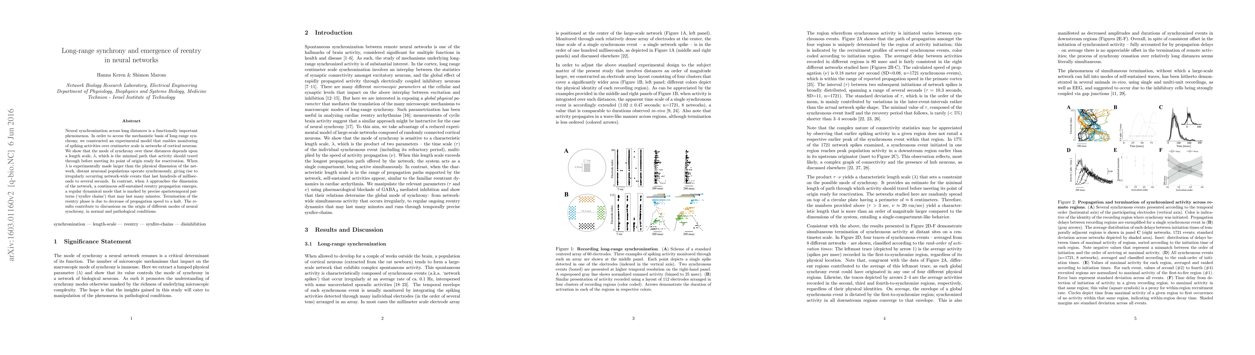 Synchronization across long neural distances is a functionally important phenomenon. In order to access the mechanistic basis of long-range synchrony, we constructed an experimental model that enables monitoring of spiking activities over centimeter scale distances in large random networks of cortical neutrons. We show that the mode of synchrony over these distances depends upon a length scale, $\lambda$, which is the minimal path that activity should travel through before meeting its point of origin ready for reactivation. When $\lambda$ is experimentally made larger than the physical dimension of the network, distant neuronal populations operate synchronously, giving rise to irregularly occurring network-wide events that last hundreds of milliseconds to couple of seconds. In contrast, when $\lambda$ approaches the dimension of the network, a continuous self-sustained reentry propagation emerges, a regular dynamical mode that is marked by precise spatiotemporal patterns (`synfire chains') that may last many minutes. These results contribute to discussions on the origin of different modes of neural synchrony in normal and pathological conditions