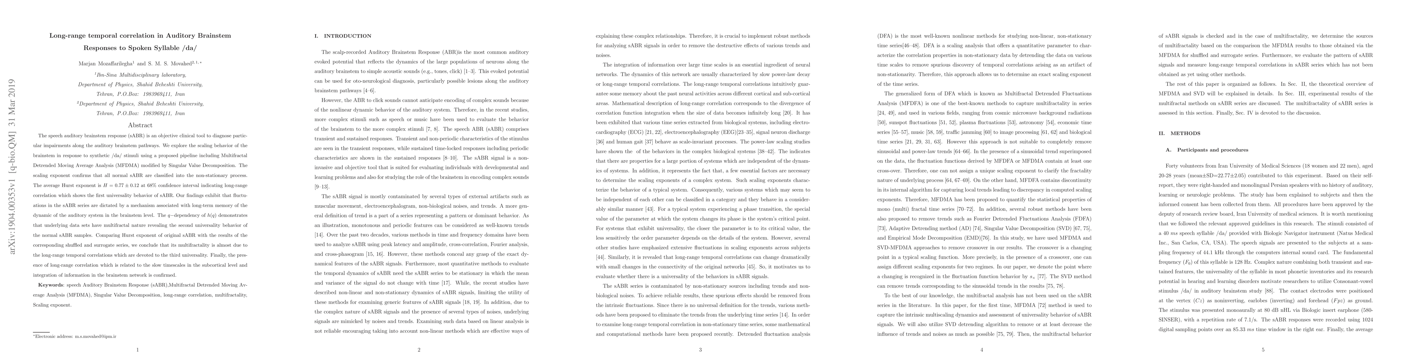 This study uses Multifractal Detrended Moving Average Analysis to investigate the long-range temporal correlation in auditory brainstem responses to the syllable /da/. The findings reveal a Hurst exponent of $H=0.77\pm0.12$, indicating long-range correlation and multifractal nature, suggesting the brainstem's dynamic memory and information integration processes.