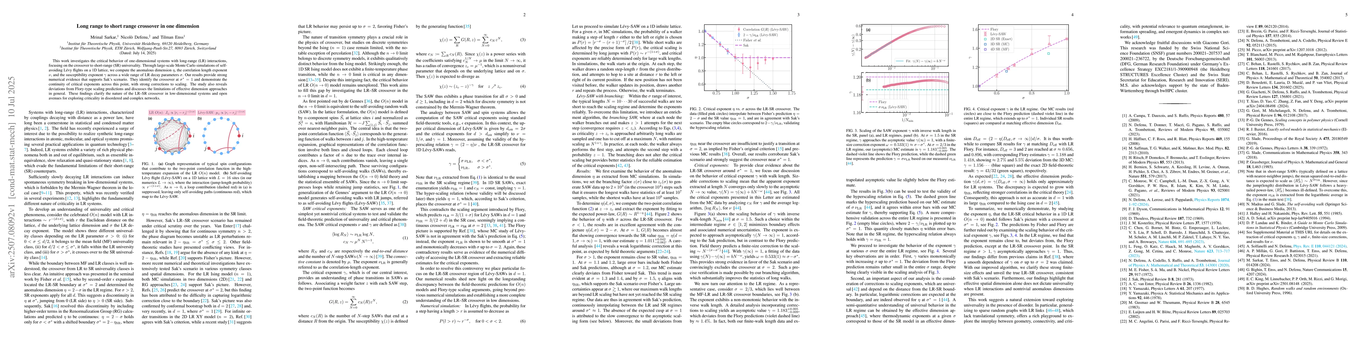 This work investigates the critical behavior of one-dimensional systems with long-range (LR) interactions, focusing on the crossover to short-range (SR) universality. Through large-scale Monte Carlo simulations of self-avoiding L\'evy flights on a 1D lattice, we compute the anomalous dimension \eta, the correlation length exponent \nu, and the susceptibility exponent \gamma across a wide range of LR decay parameters \sigma. Our results provide strong numerical evidence that supports Sak's scenario. They identify the crossover at \sigma^* = 1 and demonstrate the continuity of critical exponents across this point, with strong corrections to scaling. The study also reveals deviations from Flory-type scaling predictions and discusses the limitations of effective dimension approaches in general. These findings clarify the nature of the LR-SR crossover in low-dimensional systems and open avenues for exploring criticality in disordered and complex networks.
