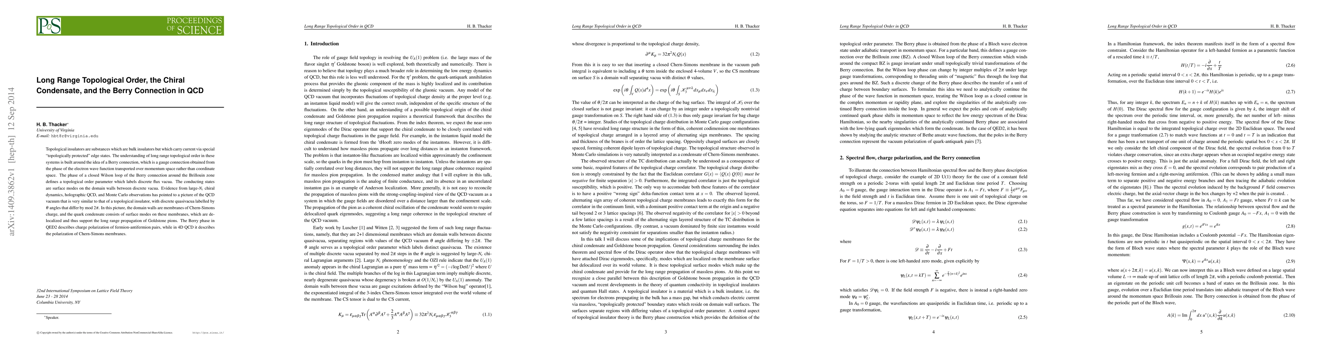 This paper explores the analogy between topological insulators and Quantum Chromodynamics (QCD), focusing on long-range topological order, the chiral condensate, and the Berry connection. It suggests that QCD's vacuum structure resembles topological insulators, with discrete quasivacua defined by $\theta$ angles and domain walls supporting surface modes for Goldstone pions.