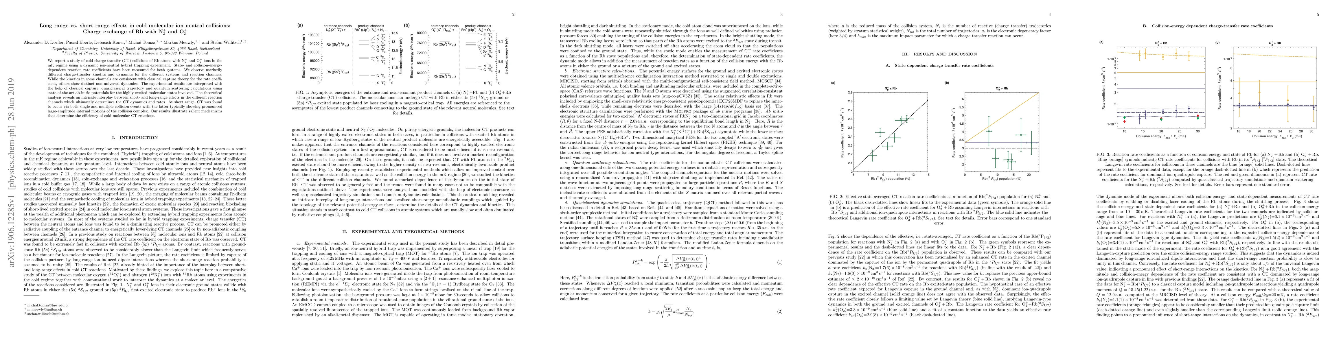 We report a study of cold charge-transfer (CT) collisions of Rb atoms with N$_2^+$ and O$_2^+$ ions in the mK regime using a dynamic ion-neutral hybrid trapping experiment. State- and collision-energy- dependent reaction rate coefficients have been measured for both systems. We observe markedly different charge-transfer kinetics and dynamics for the different systems and reaction channels. While the kinetics in some channels are consistent with classical capture theory for the rate coefficient, others show distinct non-universal dynamics. The experimental results are interpreted with the help of classical capture, quasiclassical trajectory and quantum scattering calculations using state-of-the-art ab-initio potentials for the highly excited molecular states involved. The theoretical analysis reveals an intricate interplay between short- and long-range effects in the different reaction channels which ultimately determines the CT dynamics and rates. At short range, CT was found to occur via both single and multiple collision events with the latter typically showing pronounced large-amplitude internal motions of the collision complex. Our results illustrate salient mechanisms that determine the efficiency of cold molecular CT reactions.