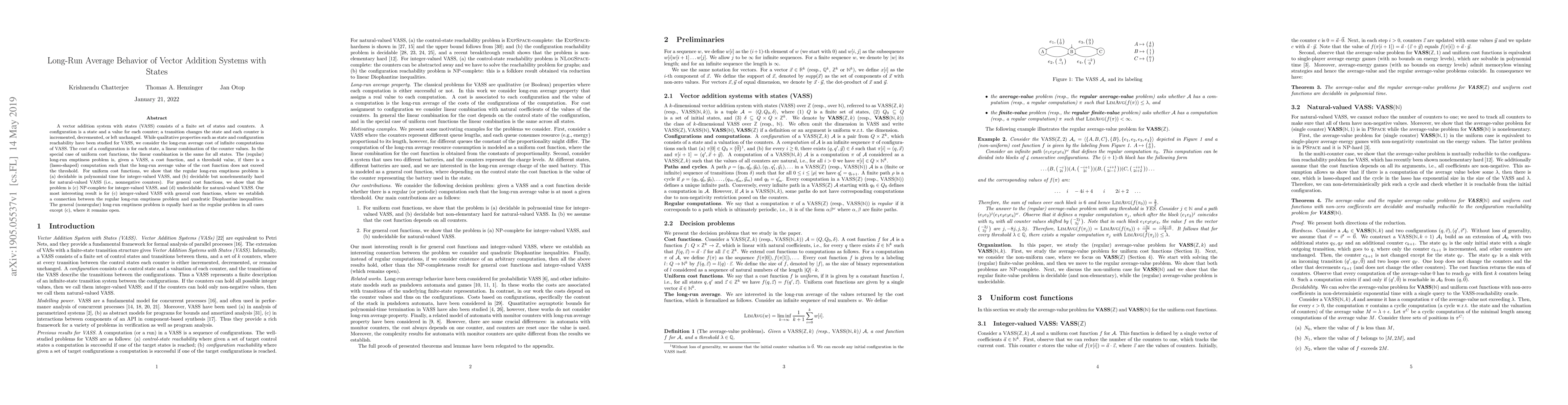 A vector addition system with states (VASS) consists of a finite set of states and counters. A configuration is a state and a value for each counter; a transition changes the state and each counter is incremented, decremented, or left unchanged. While qualitative properties such as state and configuration reachability have been studied for VASS, we consider the long-run average cost of infinite computations of VASS. The cost of a configuration is for each state, a linear combination of the counter values. In the special case of uniform cost functions, the linear combination is the same for all states. The (regular) long-run emptiness problem is, given a VASS, a cost function, and a threshold value, if there is a (lasso-shaped) computation such that the long-run average value of the cost function does not exceed the threshold. For uniform cost functions, we show that the regular long-run emptiness problem is (a)~decidable in polynomial time for integer-valued VASS, and (b)~decidable but nonelementarily hard for natural-valued VASS (i.e., nonnegative counters). For general cost functions, we show that the problem is (c)~NP-complete for integer-valued VASS, and (d)~undecidable for natural-valued VASS. Our most interesting result is for (c) integer-valued VASS with general cost functions, where we establish a connection between the regular long-run emptiness problem and quadratic Diophantine inequalities. The general (nonregular) long-run emptiness problem is equally hard as the regular problem in all cases except (c), where it remains open.