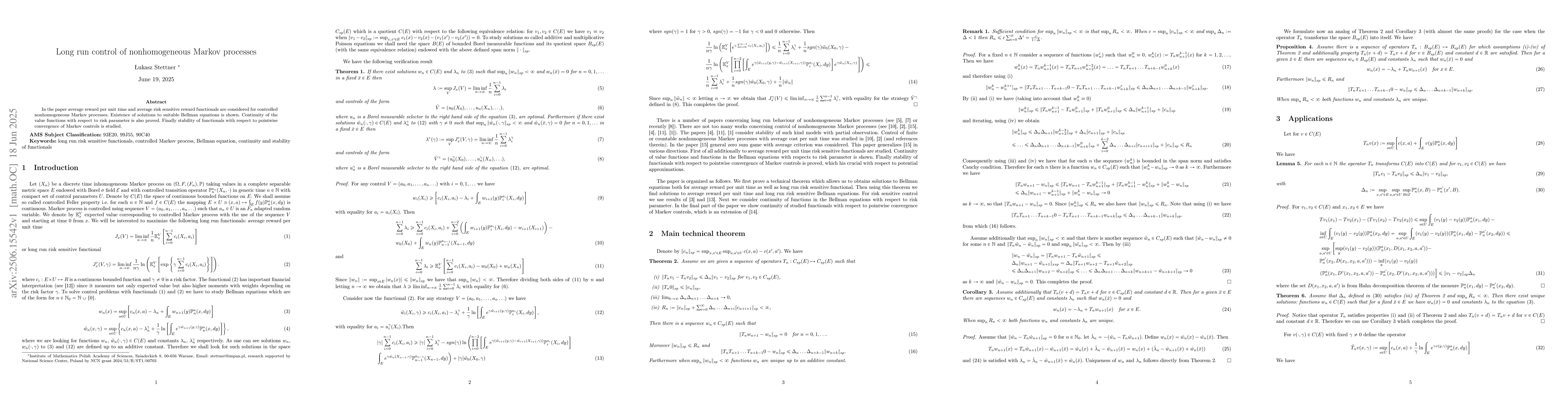 In the paper average reward per unit time and average risk sensitive reward functionals are considered for controlled nonhomogeneous Markov processes. Existence of solutions to suitable Bellman equations is shown. Continuity of the value functions with respect to risk parameter is also proved. Finally stability of functionals with respect to pointwise convergence of Markov controls is studied.