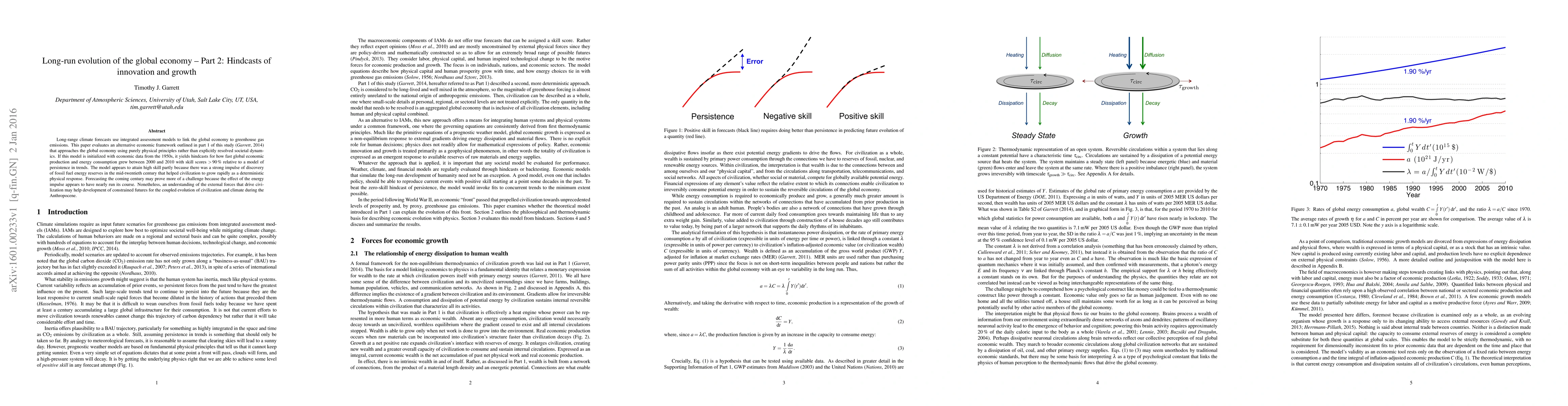 Long-range climate forecasts use integrated assessment models to link the global economy to greenhouse gas emissions. This paper evaluates an alternative economic framework outlined in part 1 of this study (Garrett, 2014) that approaches the global economy using purely physical principles rather than explicitly resolved societal dynamics. If this model is initialized with economic data from the 1950s, it yields hindcasts for how fast global economic production and energy consumption grew between 2000 and 2010 with skill scores > 90 % relative to a model of persistence in trends. The model appears to attain high skill partly because there was a strong impulse of discovery of fossil fuel energy reserves in the mid-twentieth century that helped civilization to grow rapidly as a deterministic physical response. Forecasting the coming century may prove more of a challenge because the effect of the energy impulse appears to have nearly run its course. Nonetheless, an understanding of the external forces that drive civilization may help development of constrained futures for the coupled evolution of civilization and climate during the Anthropocene.