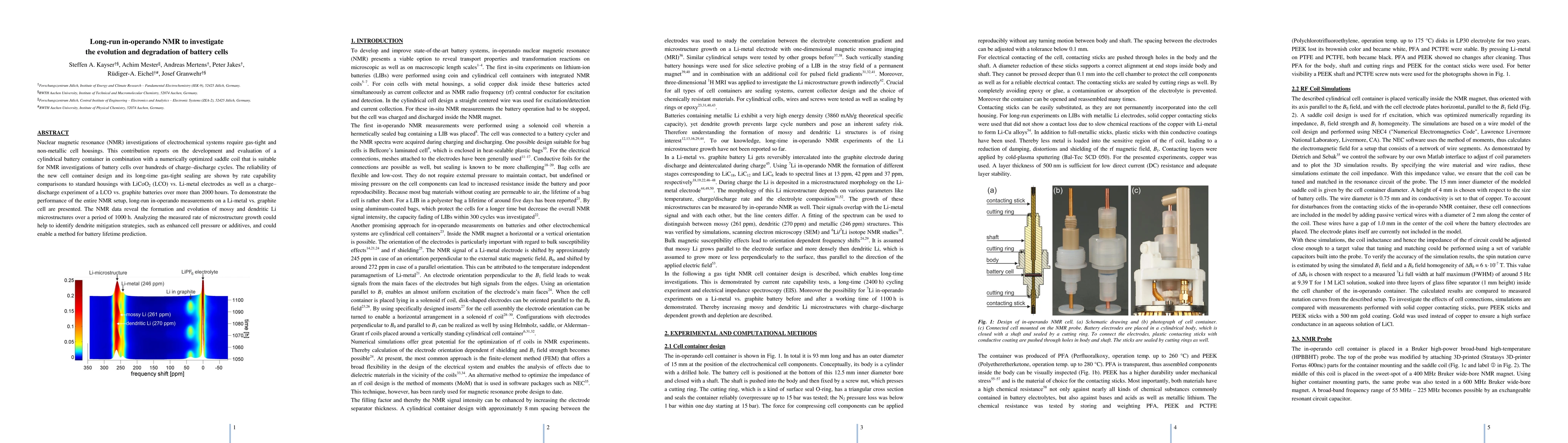 Nuclear magnetic resonance (NMR) investigations of electrochemical systems require gas-tight and non-metallic cell housings. This contribution reports on the development and evaluation of a cylindrical battery container in combination with a numerically optimized saddle coil that is suitable for NMR investigations of battery cells over hundreds of charge-discharge cycles. The reliability of the new cell container design and its long-time gas-tight sealing are shown by rate capability comparisons to standard housings with LiCoO$_{2}$ (LCO) vs. Li-metal electrodes as well as a charge-discharge experiment of a LCO vs. graphite batteries over more than 2000 hours. To demonstrate the performance of the entire NMR setup, long-run in-operando measurements on a Li-metal vs. graphite cell are presented. The NMR data reveal the formation and evolution of mossy and dendritic Li microstructures over a period of 1000 h. Analyzing the measured rate of microstructure growth could help to identify dendrite mitigation strategies, such as enhanced cell pressure or additives, and could enable a method for battery lifetime prediction.